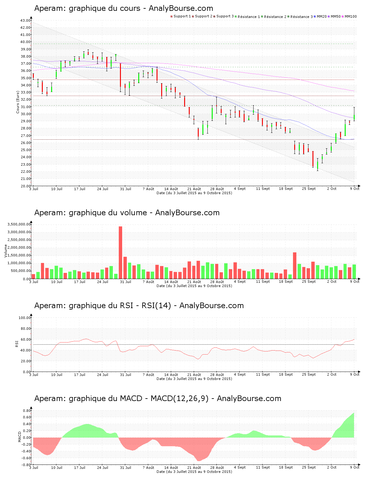 Ces informations constituent une analyse technique de l’action Aperam au dimanche 11 octobre 2015. Cette analyse peut être invalidée par des éléments plus récents, et ne constitue en aucune manière une incitation d’achat ou de vente sur les marchés financiers. Le lecteur reste libre et responsable de l’interprétation et de l’usage faits de ces informations.