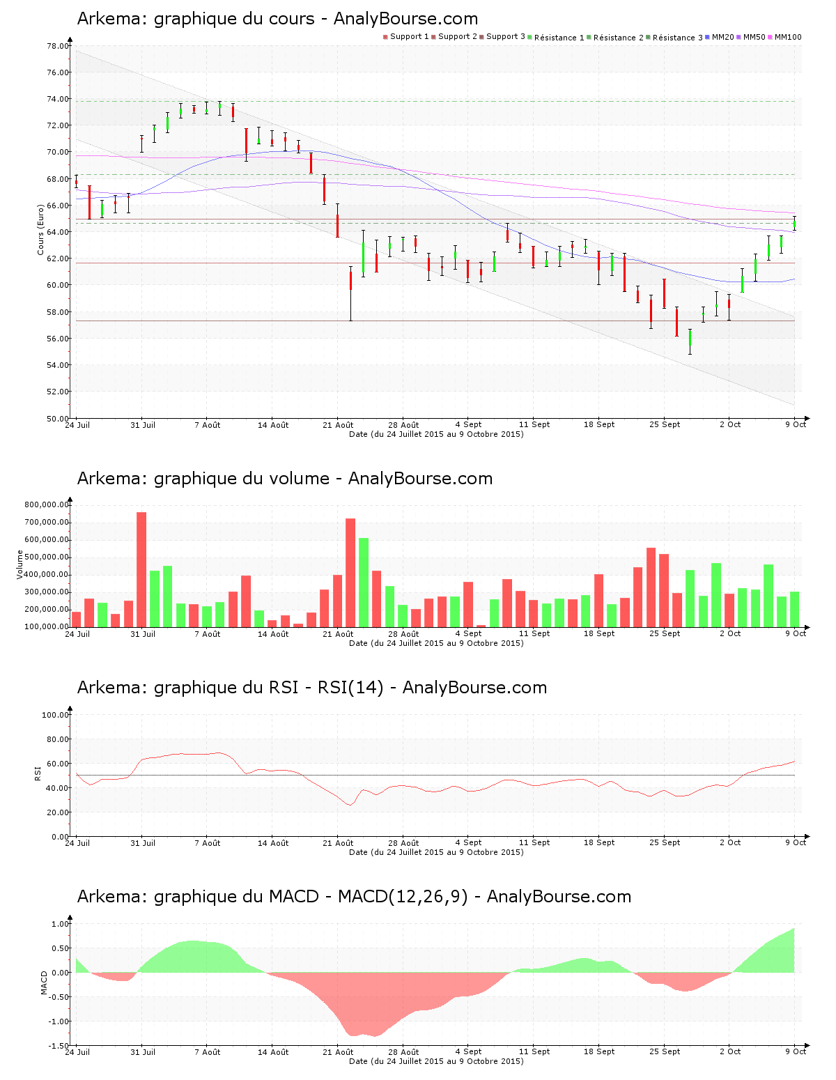 Concernant les indicateurs, l’indicateur RSI est ces cinq dernières séances de cotations en progression. C’est à présent au niveau d’achat que ce dernier se localise. Pour sa part, la moyenne mobile sur 20 jours de la valeur Arkema se positionne en-dessous de la moyenne mobile sur 50 jours, et la moyenne mobile sur 50 jours se localise pour sa part en deçà de la moyenne mobile sur 100 jours. Sur une longue période, l’action montre par conséquent un comportement baissier. Cela fait dorénavant 78 jours de cotations que la moyenne mobile sur 50 jours de l’action Arkema se place en deçà de sa moyenne mobile sur 100 jours. Enfin, on note que ces dernières séances le MACD est en vigoureuse progression. C’est finalement une tendance du titre en substantielle hausse que ce dernier suggère à court-moyen terme. Le MACD est passé en secteur positif lundi dernier, ce qui pourrait indiquer un prélude de tendance croissante sur le long terme pour Arkema.