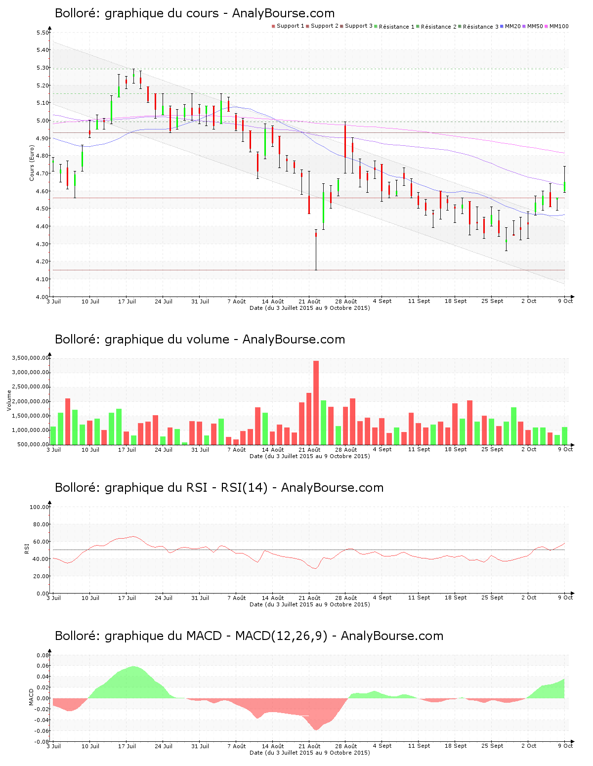 Pour les indicateurs, on relève que ces dernières séances le MACD est en progression. C’est à présent une évolution du cours en croissance qu’il dévoile sur le court-moyen terme. Ensuite, la valeur Bolloré dispose d’une moyenne mobile sur vingt jours positionnée en deçà de sa moyenne mobile sur cinquante jours, qui est quant à elle placée en-dessous de sa moyenne mobile sur cent jours. L’action dévoile donc un comportement baissier à long terme. Depuis désormais 37 jours de cotations, la moyenne mobile sur vingt jours de la valeur Bolloré se localise en deçà de sa moyenne mobile sur cinquante jours. Enfin, on repère que ces derniers jours le RSI est en progression. C’est à présent dans le niveau d’achat que ce dernier se positionne.