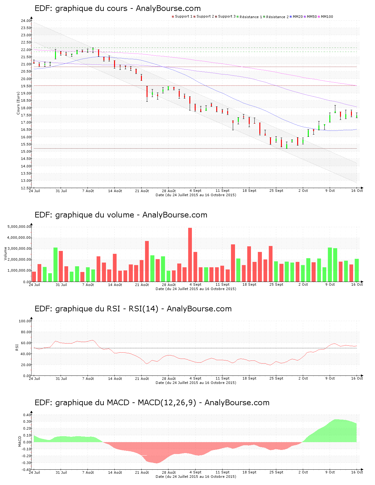 |L’action EDF est plutôt stable ces cinq derniers jours de cotations, avec un cours décroissant de 0.17%. Cette dernière s’effrite faiblement en effet juste de 0.030 €, allant de 17.480 € à 17.450 € cette semaine. EDF était au contraire en forte augmentation la semaine dernière, avec un mouvement haussier de 10.56%. Notons, avec un taux de 5.77% éloignant ces derniers jours les extremums, des échanges assez agités sur EDF. La valeur ne se confine plus dans le canal à l’intérieur duquel elle variait depuis un certain temps. Maintenant, cette dernière évolue fortement au-dessus de son canal.