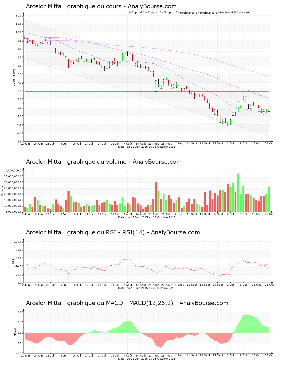 En ce qui concerne les indicateurs, on relève que ces cinq dernières séances de cotations l’indicateur RSI est assez stable. Ce dernier se place par conséquent toujours dans le niveau neutre. On constate que ces cinq derniers jours de cotations le MACD est en vigoureuse diminution. Ce dernier esquisse malgré ceci toujours une tendance du cours en progression à moyen-court terme. Pour terminer, la moyenne mobile sur 20 jours de l’action Arcelor Mittal se positionne en deçà de la moyenne mobile sur 50 jours, qui se trouve elle-même en deçà de la moyenne mobile sur 100 jours. Sur la durée, le comportement de l’action est par conséquent en diminution. Depuis à présent 88 jours de cotations, la moyenne mobile sur 20 jours de la valeur Arcelor Mittal se localise en deçà de sa moyenne mobile sur 50 jours.