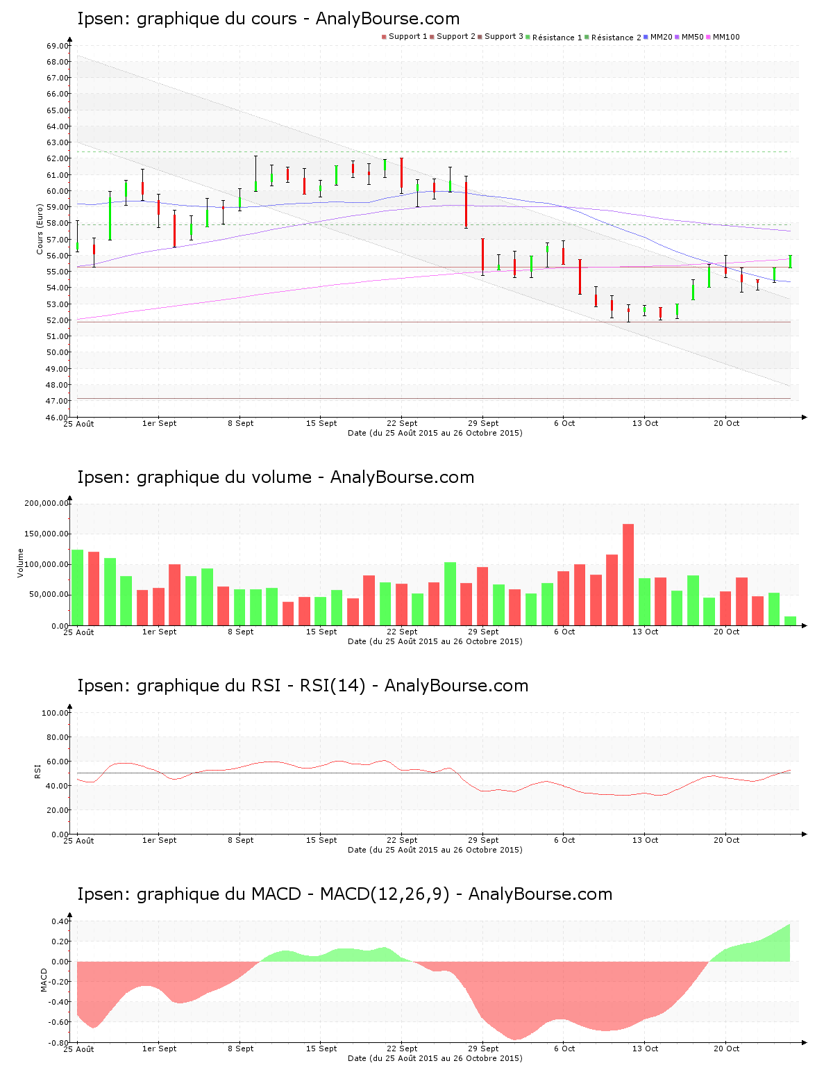 Concernant le MACD, on note que ce dernier est en conséquente croissance ce lundi. Ce dernier dessine finalement une tendance du titre en substantielle progression à moyen terme. L’indicateur RSI est en croissance ce jour. Il a basculé au niveau d’achat, ceci pourrait ébaucher une amorce d’une trajectoire haussière sur la durée pour l’action Ipsen.
