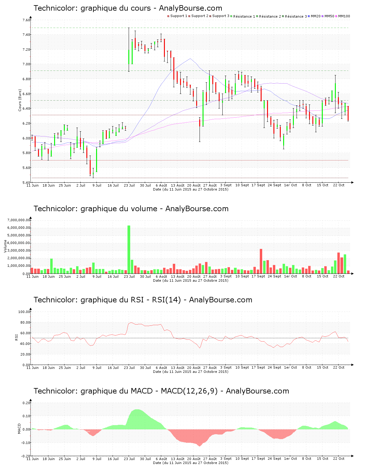 Avec un développement baissier de 3.55%, le résultat est extrêmement mauvais ce mardi 27 octobre pour la valeur Technicolor, dans un volume d’environ 382000 titres échangés à 09:57. L’action plonge finalement de 0.230 €, naviguant de 6.470 € à 6.240 €. Avec un comportement plutôt stable de 0.31%, Technicolor était hier peu désiré. Le mouvement baissier reprend ainsi aujourd’hui. Technicolor varie ce jour dans des limites de 3.21%, ce qui suggère une relative instabilité sur le titre. Le cours a franchi le support des 6.310 € ce mardi 27 octobre. Le prochain support se trouve à 5.700 €.