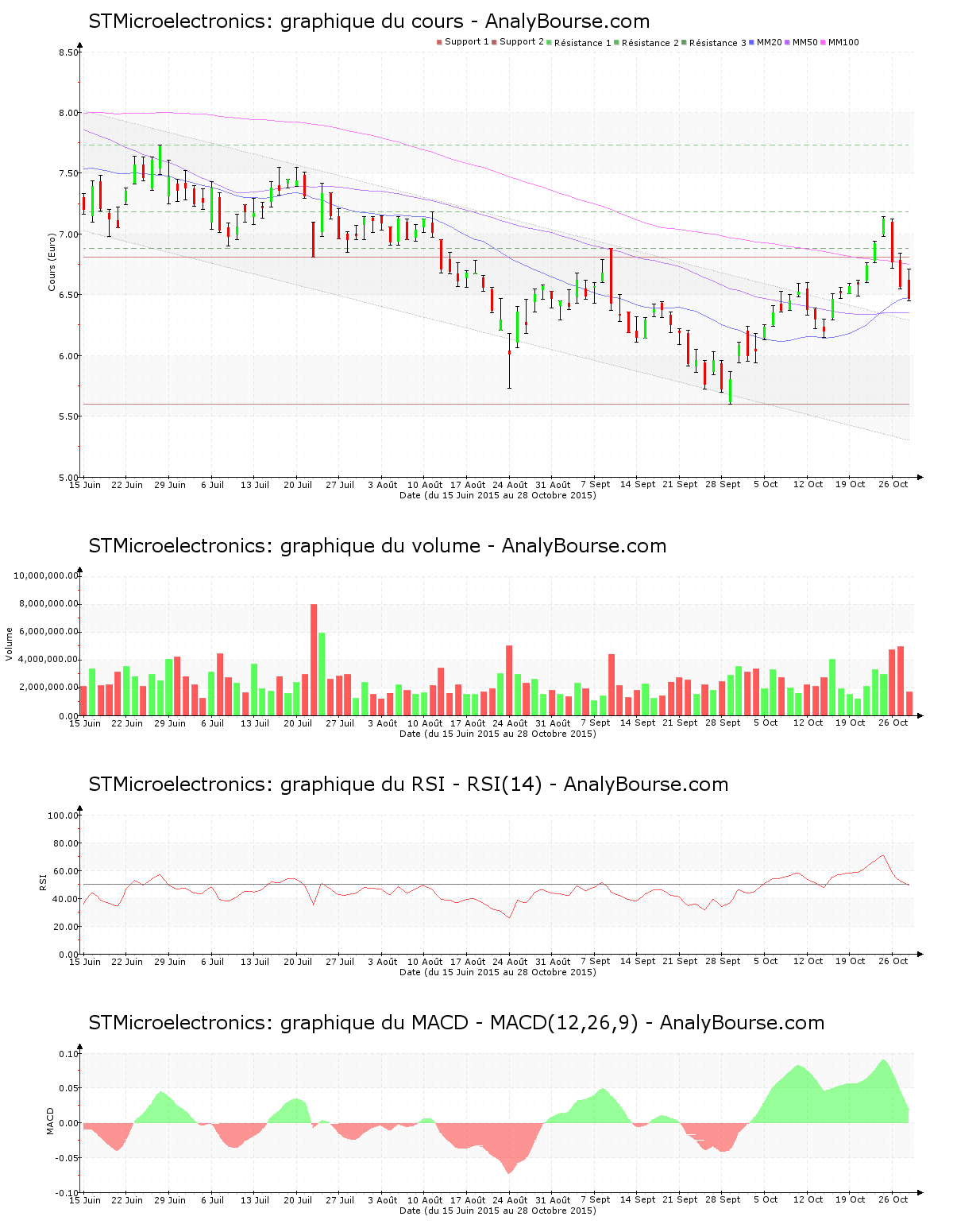 L’indicateur RSI est en diminution ce jour. Il est passé au niveau de vente, cela pourrait indiquer un engagement d’une évolution baissière pour l’action STMicroelectronics à longue échéance.