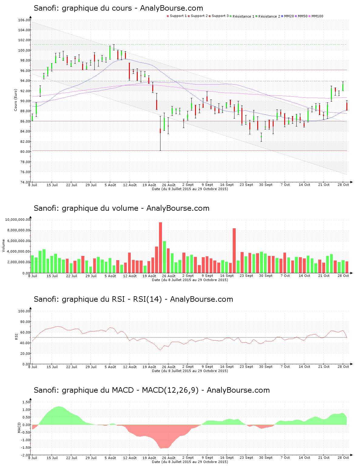 On remarque que le RSI est en régression ce jour. Il a basculé au niveau de vente, ce qui peut ébaucher une ébauche de tendance en diminution pour l’action Sanofi à long terme. Le MACD est en conséquente régression ce jour. Ce dernier suggère malgré ceci toujours une trajectoire du titre en ferme augmentation sur le court-moyen terme.