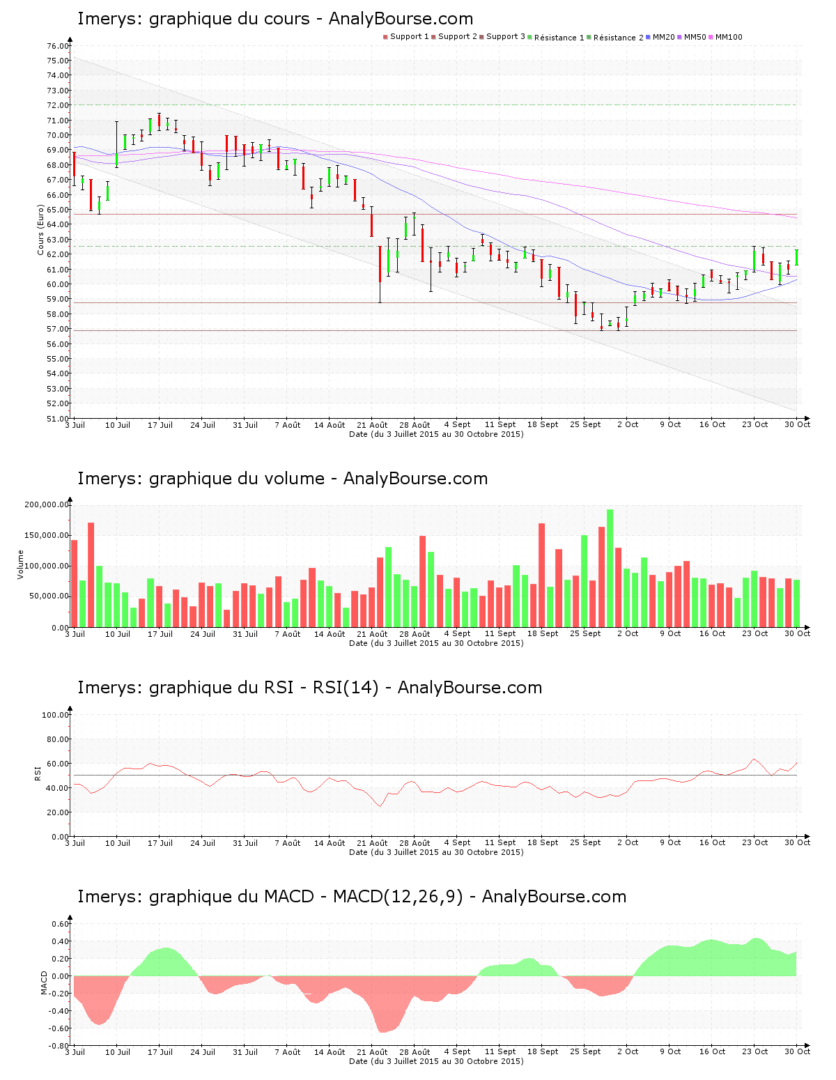 La valeur Imerys augmente faiblement ces dernières séances, avec un cours en hausse de 0.18%. Elle s’apprécie un peu en effet seulement de 0.110 €, naviguant de 62.180 € à 62.290 € ces cinq dernières séances. Incarnée par un développement haussier de 2.91%, la volonté d’achat sur Imerys la semaine dernière était au contraire bien présente. C’est la première fois que la valeur Imerys franchit ce seuil depuis le jeudi 10 septembre 2015. Le mouvement du titre l’entraîne finalement près de la résistance des 62.500 €. L’action a dépassé la zone supérieure du canal à l’intérieur duquel cette dernière se confinait depuis un certain temps. Elle se trouve désormais fortement au-dessus de son canal.