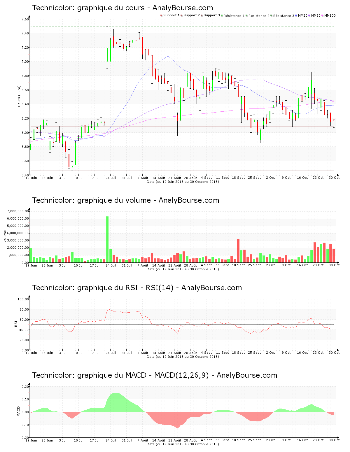 Concernant les indicateurs, on constate que le MACD est en importante décroissance ces derniers jours. C’est maintenant une tendance du titre plutôt stable que ce dernier caractérise à court-moyen terme. Mercredi dernier, le MACD a basculé du côté négatif, ce qui pourrait représenter une base de tendance en régression sur une longue période pour Technicolor. Pour sa part, on note que ces dernières séances le RSI est en diminution. C’est désormais dans le niveau de vente que ce dernier se positionne. La moyenne mobile sur vingt jours de la valeur Technicolor se situe maintenant en deçà de sa moyenne mobile sur cinquante jours depuis 35 jours.