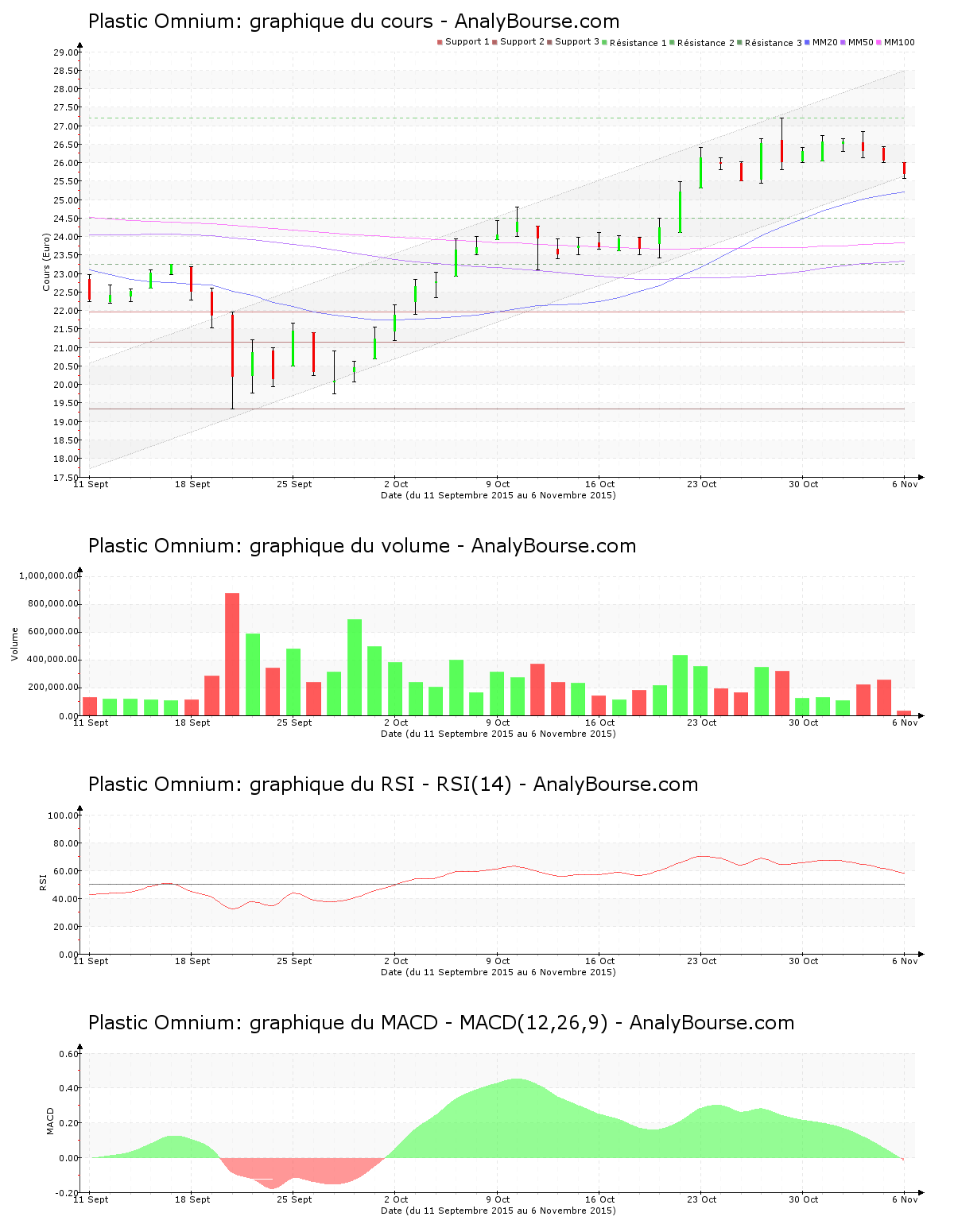 On remarque que le MACD est en importante régression ce vendredi. Le MACD est passé en territoire négatif ce jour, cela pourrait dessiner un engagement d’une évolution décroissante sur une longue période pour la valeur Plastic Omnium.