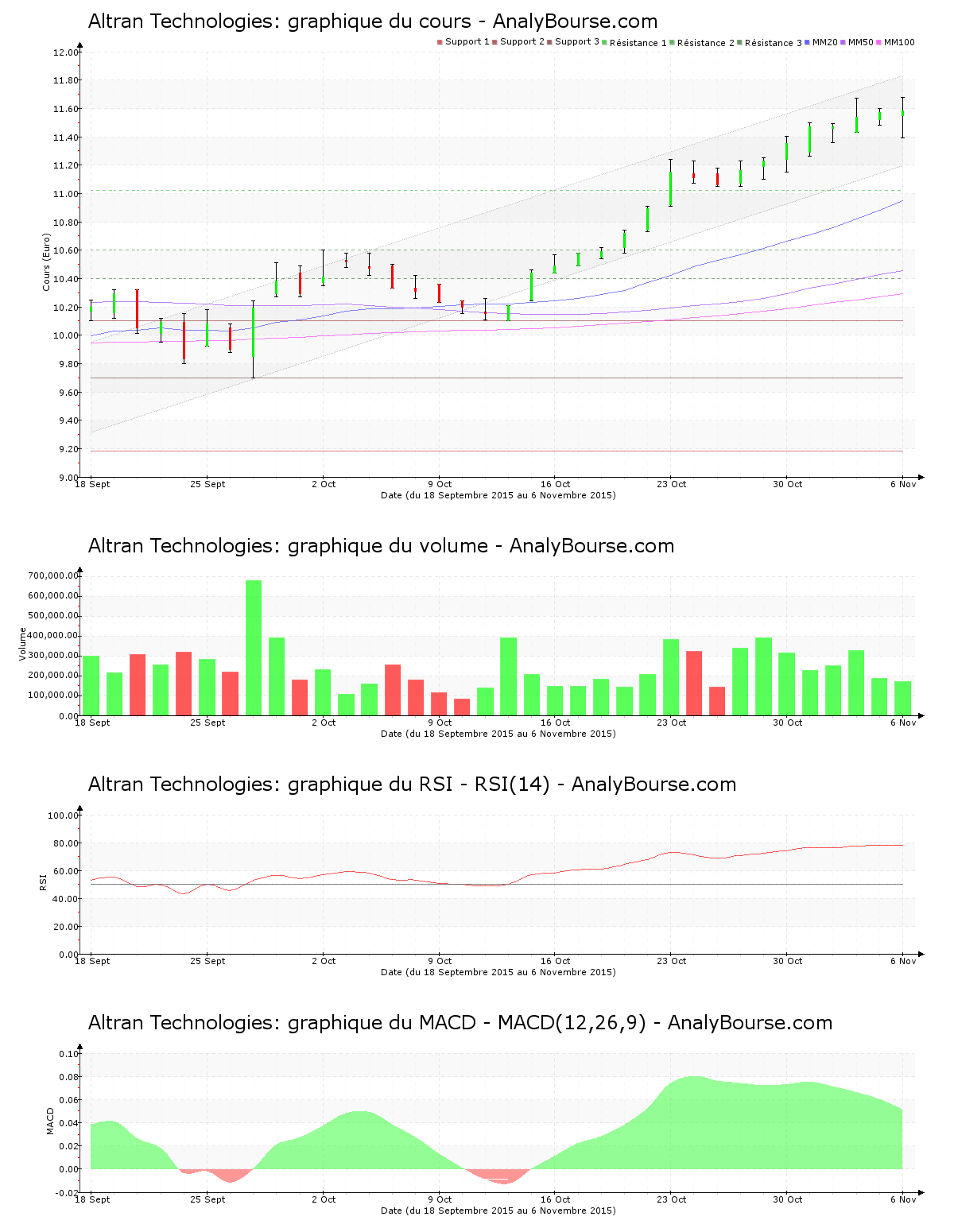 Pour les indicateurs, la moyenne mobile sur 20 jours de la valeur Altran Technologies est positionnée au-dessus de sa moyenne mobile sur 50 jours, qui est quant à elle placée au-dessus de sa moyenne mobile sur 100 jours. Le comportement de la valeur est donc en croissance à long terme. On remarque que cette semaine l’indicateur MACD est en régression. Il indique cependant encore une tendance du titre en progression sur le moyen-court terme. Pour terminer, on relève que ces dernières séances le RSI est relativement stable. C’est ainsi encore dans le niveau de surachat qu’il se trouve.
