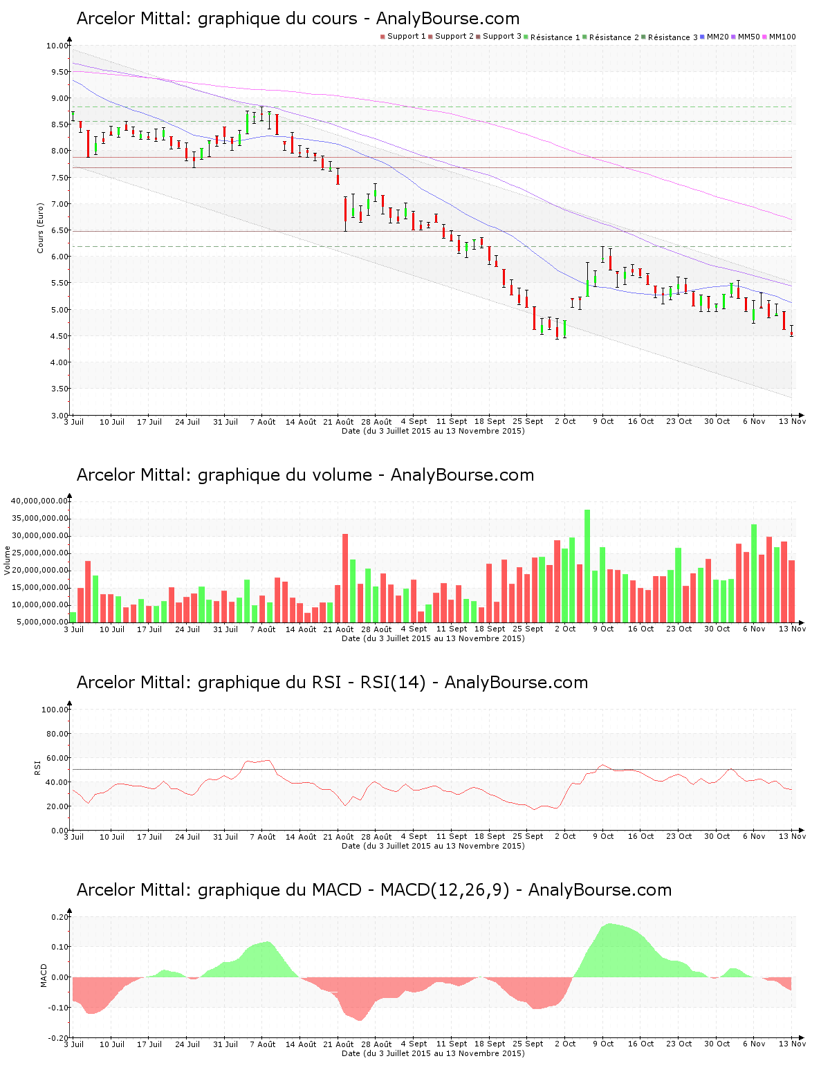 Ces informations constituent une analyse technique de la valeur Arcelor Mittal au samedi 14 novembre 2015. Cette analyse peut être invalidée par des éléments plus récents, et ne constitue en aucune manière une incitation d’achat ou de vente sur les marchés financiers. Le lecteur reste libre et responsable de l’interprétation et de l’usage faits de ces informations.
