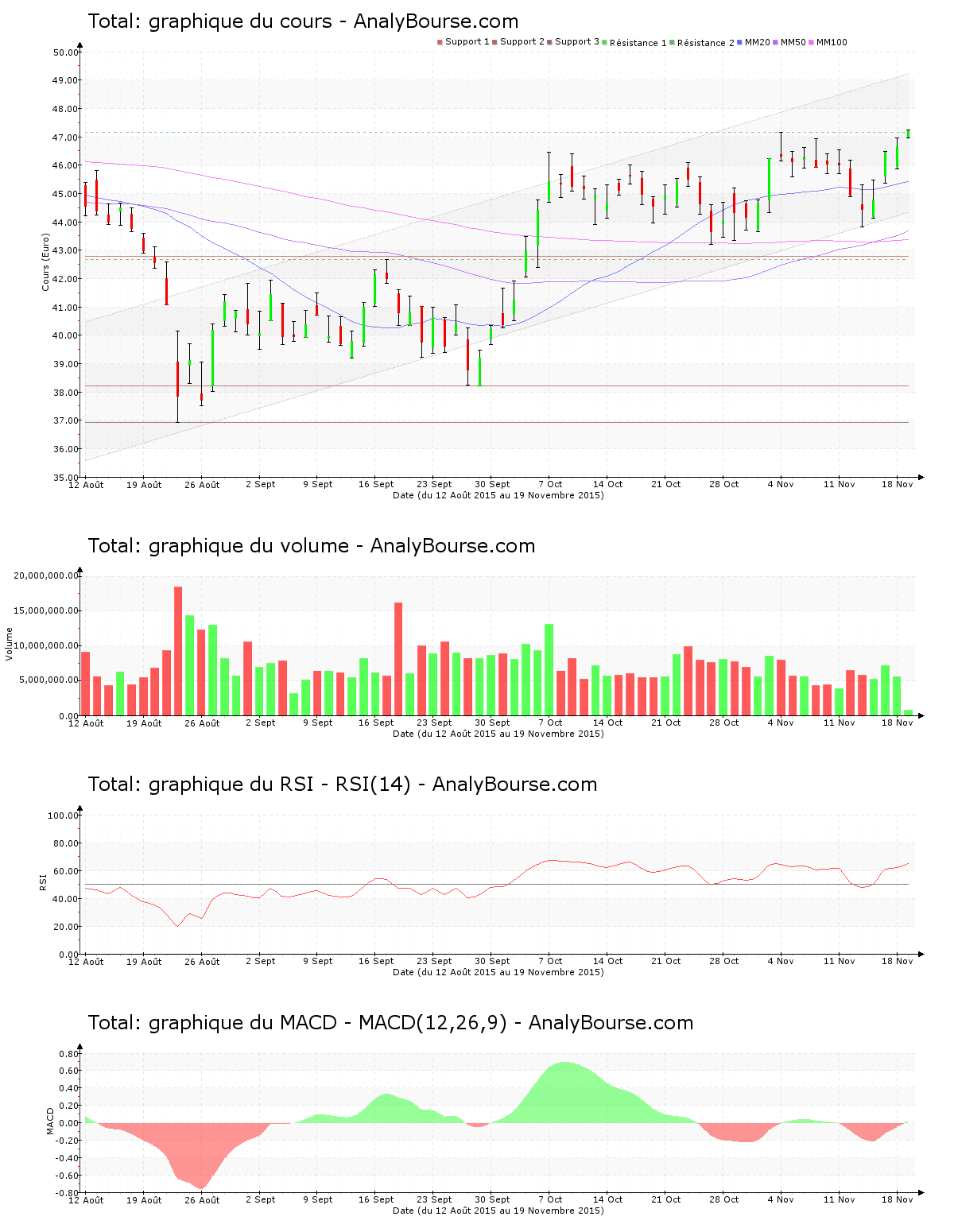 Pour les indicateurs, on constate que le MACD est en grande croissance aujourd’hui. Ce jeudi, l’indicateur MACD a basculé en territoire positif, ce qui peut signaler un démarrage d’une trajectoire haussière pour la valeur Total à long terme.