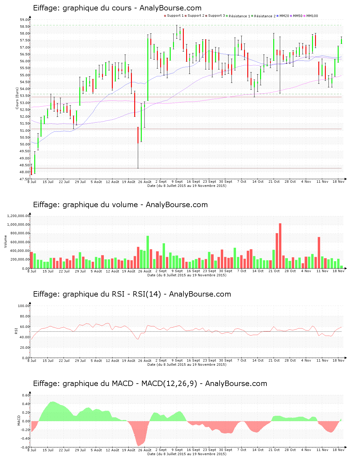 On note que ce jour l’indicateur MACD est en forte hausse. Le MACD est passé du côté positif aujourd’hui, ce qui peut esquisser un démarrage d’une orientation haussière à long terme pour la valeur Eiffage.