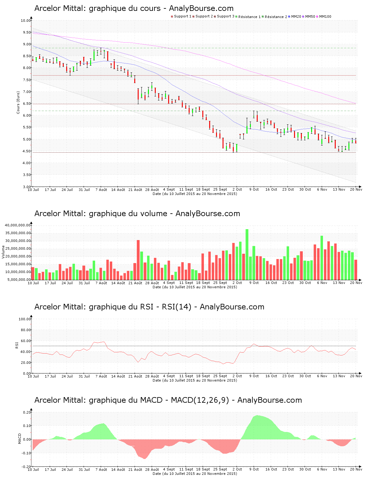 Arcelor Mittal est ces derniers jours très sollicité, avec un comportement en ferme croissance de 6.62%. La valeur atteint maintenant la cotation de 4.830 €. La volonté d’achat sur Arcelor Mittal la semaine dernière était par contre remarquablement faible, incarnée par un développement baissier de 9.40%. La tendance s’inverse par conséquent vigoureusement ces cinq dernières séances. Avec un pourcentage de 12.53% qui sépare le maximum du minimum de la valeur, on remarque une forte agitation ces cinq dernières séances de cotations sur le cours. C’est dans la zone supérieure de son canal que la valeur varie.