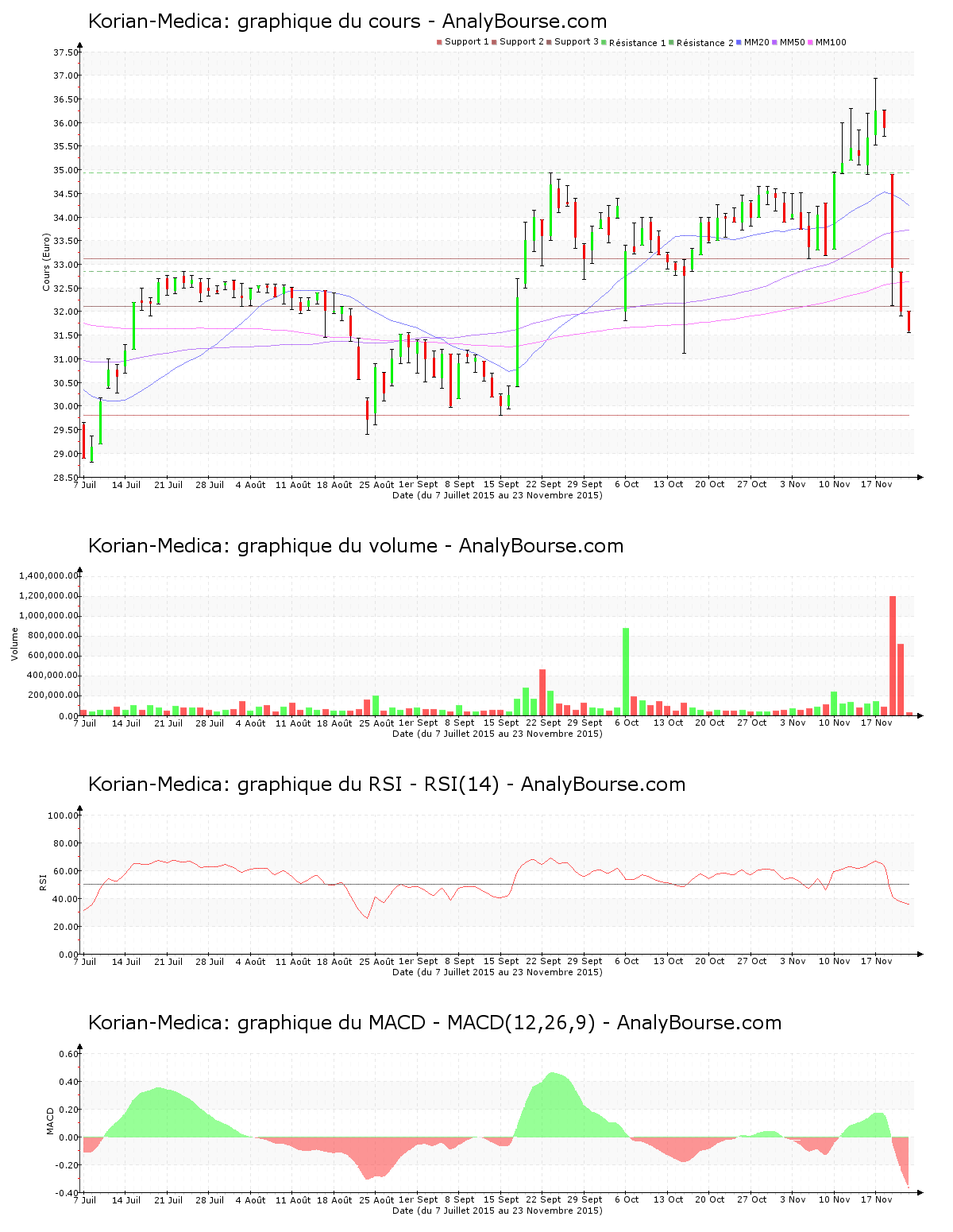 En ce qui concerne les indicateurs, l’indicateur MACD est ce lundi 23 novembre en vigoureuse diminution. Il dessine désormais une tendance du cours en solide baisse sur le court-moyen terme.