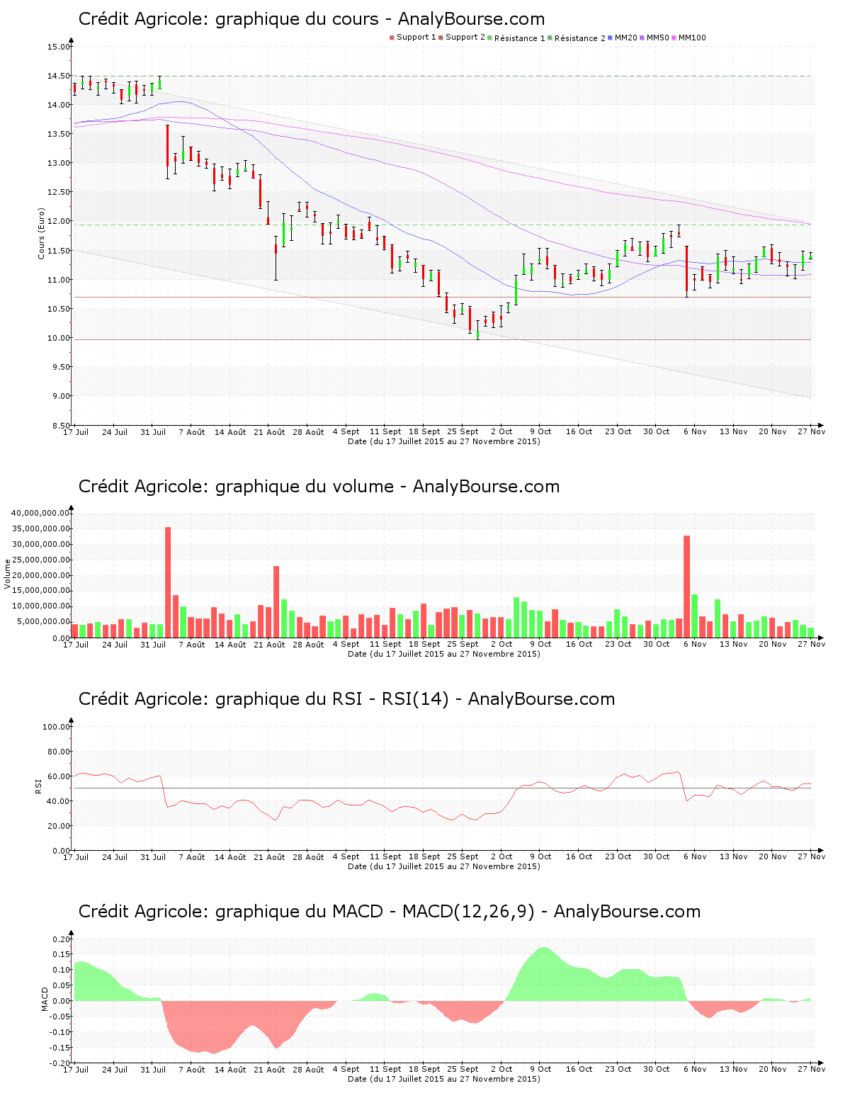Côté indicateurs, le RSI est cette semaine stable. C’est ainsi toujours au niveau neutre qu’il se positionne. Depuis maintenant 88 séances, la moyenne mobile sur cinquante jours de la valeur Crédit Agricole se positionne en deçà de sa moyenne mobile sur cent jours. Pour finir, on repère que ces dernières séances le MACD est stable. C’est ainsi encore une trajectoire du cours stable qu’il montre sur le moyen-court terme.