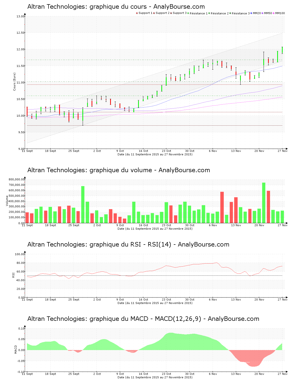 Ces informations constituent une analyse technique de l’action Altran Technologies au dimanche 29 novembre 2015. Cette analyse peut être invalidée par des éléments plus récents, et ne constitue en aucune manière une incitation d’achat ou de vente sur les marchés financiers. Le lecteur reste libre et responsable de l’interprétation et de l’usage faits de ces informations.