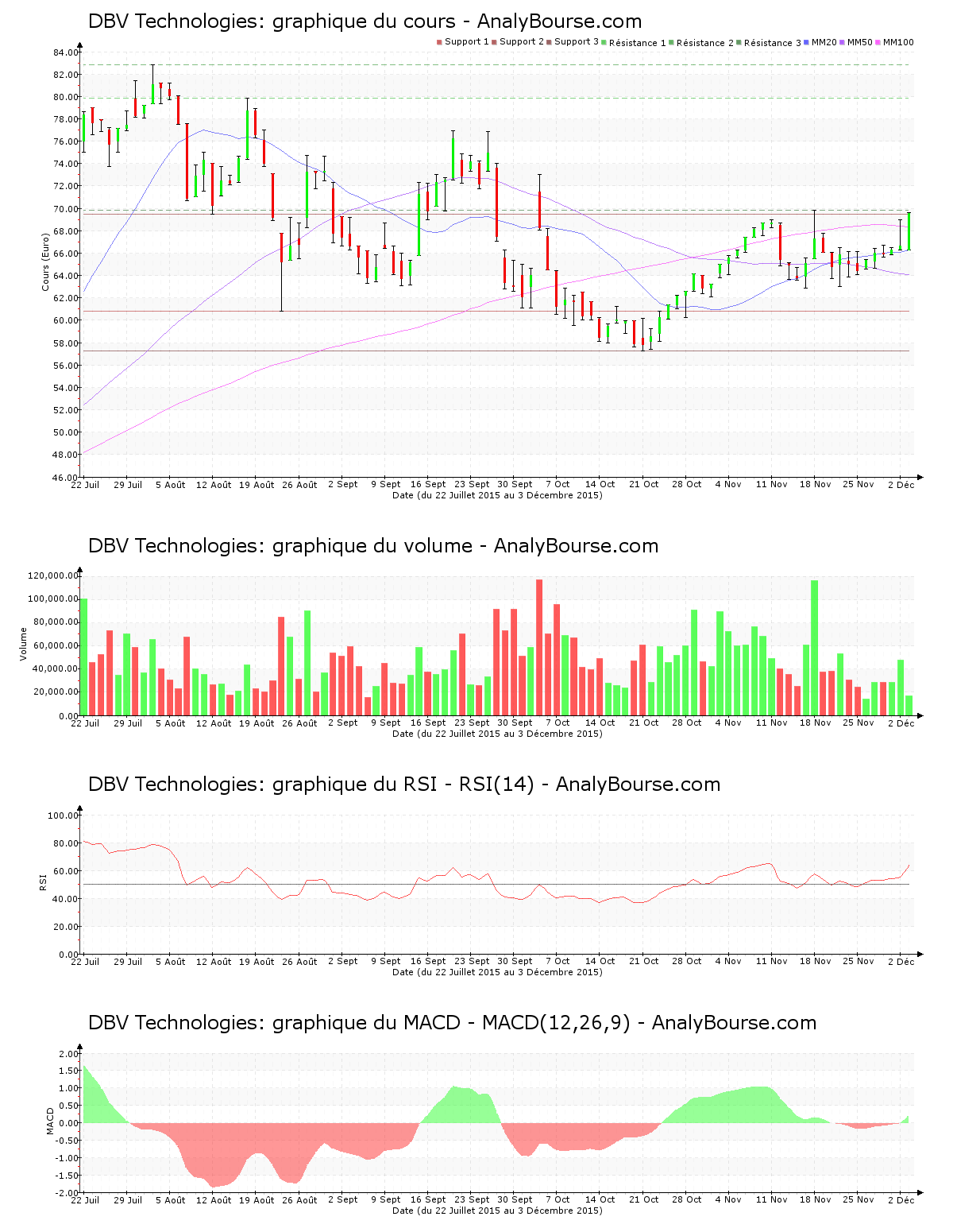 L’action DBV Technologies s’échange à son niveau d’il y a 48 jours de cotations. Dans un volume de sensiblement 17000 titres échangés à 09:39, avec un développement haussier de 4.38%, l’action DBV Technologies explose ce jour. La valeur atteint maintenant la somme de 69.520 €. DBV Technologies était assez stable hier, avec un mouvement haussier de 0.48%. Le mouvement en hausse reprend ainsi aujourd’hui. Notons, avec un taux de 5.05% qui écarte aujourd’hui le plus haut du plus bas, une relative fébrilité sur DBV Technologies. Le cours fluctue maintenant près de la résistance des 69.800 €.