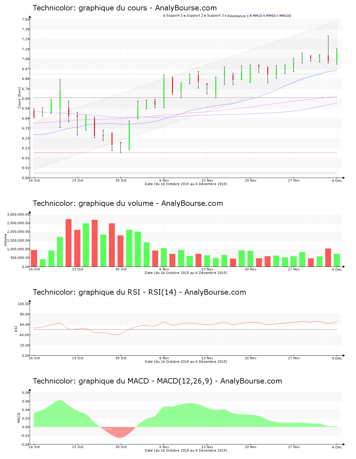 C’est la première fois depuis le mardi 11 août 2015 que la valeur Technicolor passe ce niveau. Avec un parcours haussier de 1.42%, la valeur Technicolor est en croissance ces cinq derniers jours. Cette dernière se négocie maintenant à 7.150 €. Technicolor stagnait la semaine dernière, avec un cours haussier de 0.86%. Le mouvement en hausse reprend ainsi cette semaine. La valeur se positionne au milieu du canal dans lequel elle s’enferme ces dernières semaines.