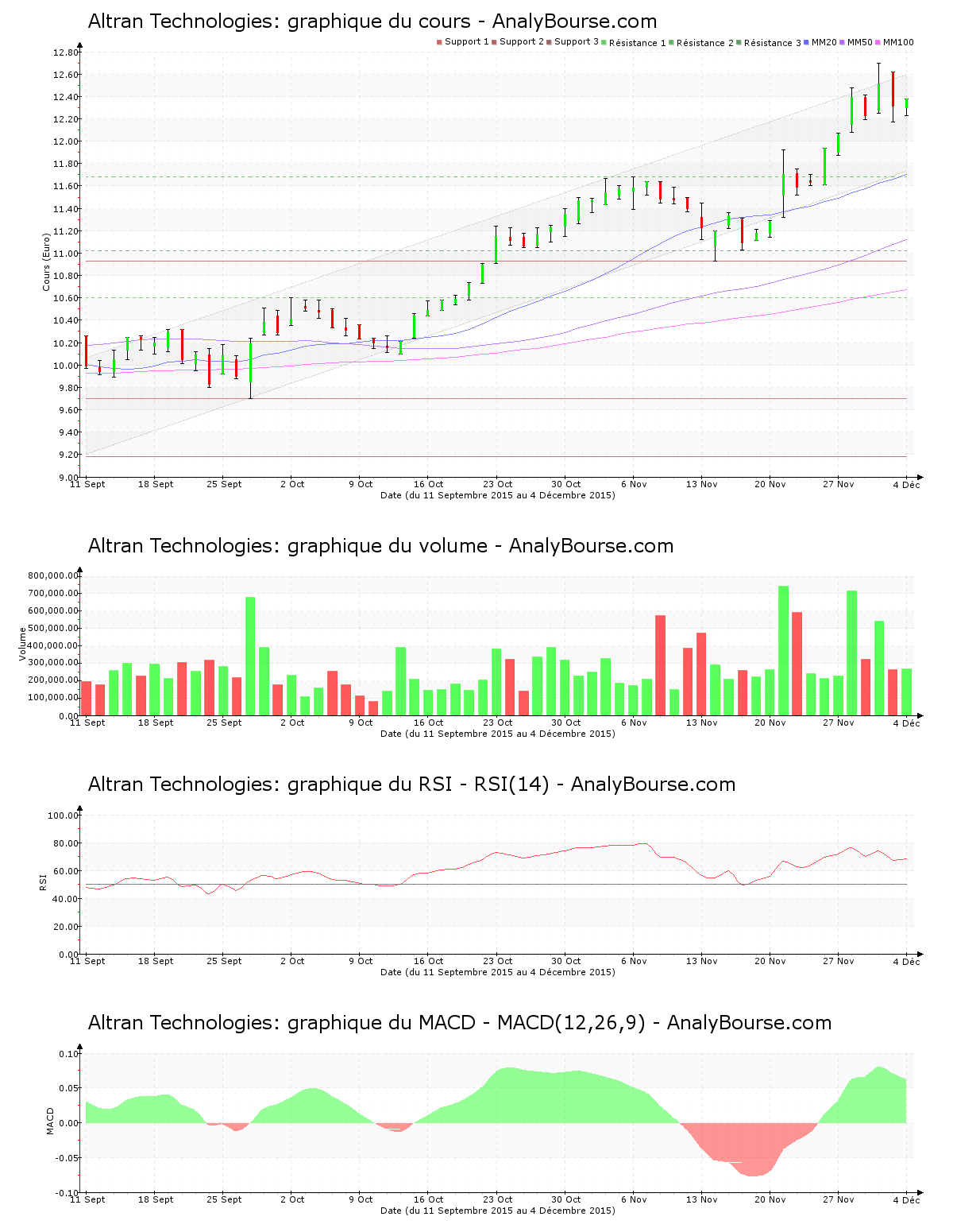 Pour les indicateurs, la moyenne mobile sur 20 jours de l’action Altran Technologies est placée au-delà de sa moyenne mobile sur 50 jours, qui est quant à elle placée au-dessus de sa moyenne mobile sur 100 jours. Sur le long terme, l’action montre par conséquent un parcours haussier. La moyenne mobile sur 20 jours de la valeur Altran Technologies se place à présent au-dessus de sa moyenne mobile sur 50 jours depuis 41 séances. Le MACD est ces dernières séances en hausse. Il indique dorénavant une trajectoire du cours en grande progression sur le court-moyen terme. Enfin, on remarque que ces dernières séances le RSI est relativement stable. Il se place donc toujours au niveau d’achat.