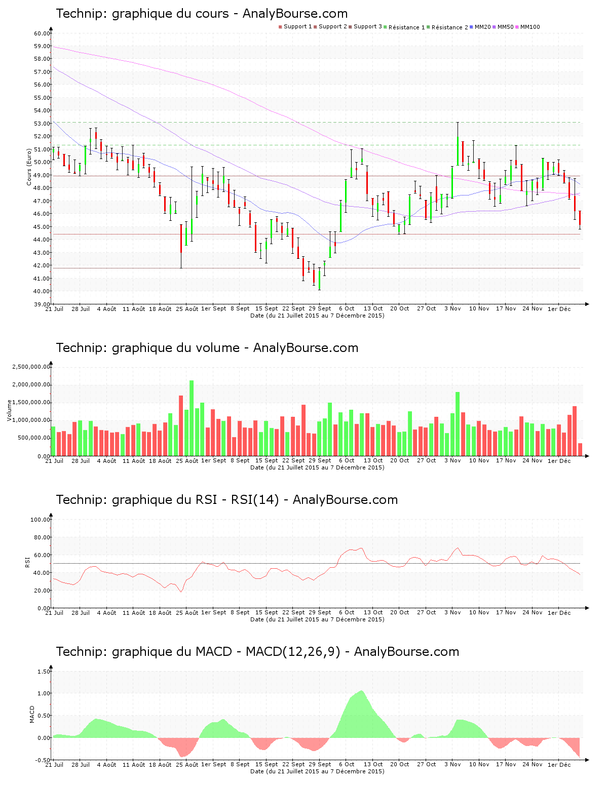 Il s’agit de la première fois que l’action Technip franchit ce seuil depuis pas moins de 33 séances de cotations. Le mouvement décroissant de l’action Technip se prolonge désormais depuis 5 séances de cotations. Le titre de Technip subit ainsi depuis mardi dernier une ferme pression vendeuse, représentée par un parcours baissier de 9.03%. La valeur Technip se dévalorise toujours ce lundi 7 décembre, avec un cours baissier de 2.36%, avec sensiblement 350000 actions échangées à 12:58. Reflétée par un parcours baissier de 2.10%, elle montrait déjà vendredi dernier une pression vendeuse. Partant de 46.220 € pour arriver à 45.130 €, la valeur diminue désormais de 1.090 €. Constatons, avec un taux de 3.13% qui distance ce jour le plus haut du plus bas, une relative instabilité sur Technip. Le cours évolue désormais proche du support des 44.390 €.