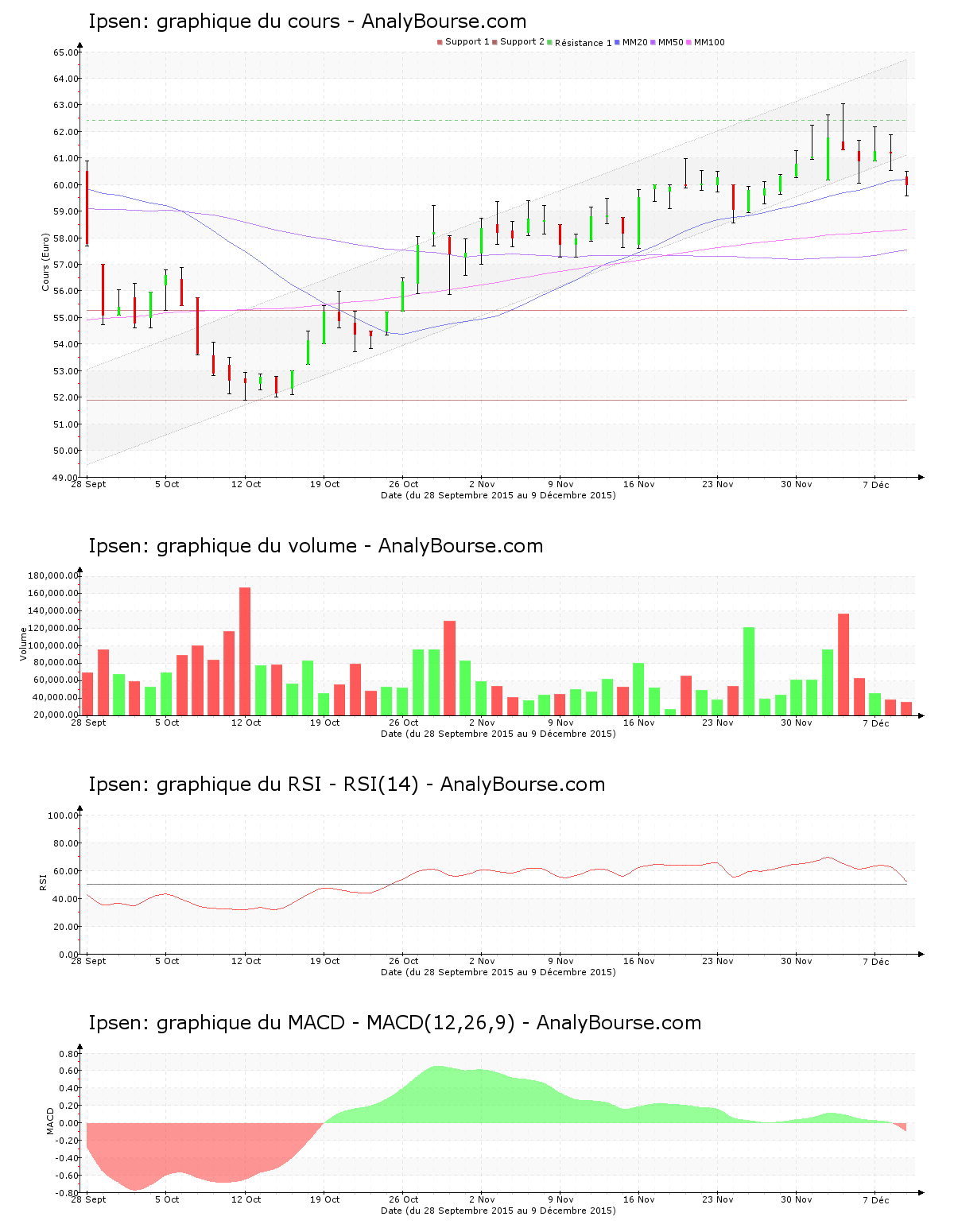 L’indicateur MACD est ce mercredi 9 décembre en ferme diminution. Le MACD a basculé en secteur négatif ce jour, ce qui pourrait signaler un amorcement de tendance en diminution à long terme pour l’action Ipsen.