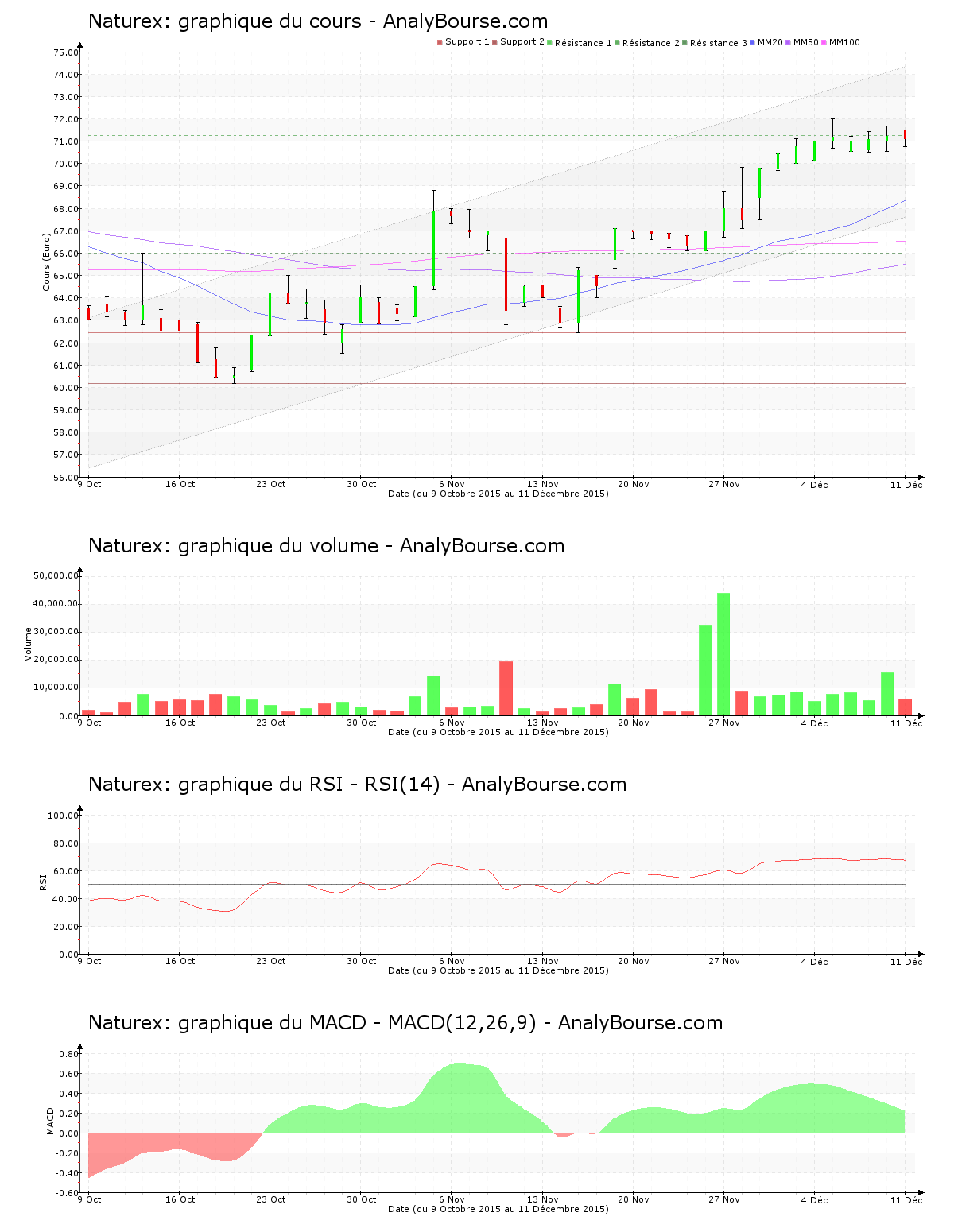 Pour les indicateurs, pour l’indicateur RSI, on relève qu’il est plutôt stable ces derniers jours. Ce dernier se positionne donc encore au niveau d’achat. Ensuite, concernant l’indicateur MACD, on note qu’il est en substantielle baisse ces dernières séances. C’est malgré ceci toujours une évolution du titre en forte croissance qu’il indique sur le moyen-court terme. Enfin, la moyenne mobile sur cinquante jours de l’action Naturex se place à présent en deçà de sa moyenne mobile sur cent jours depuis 32 jours de cotations.