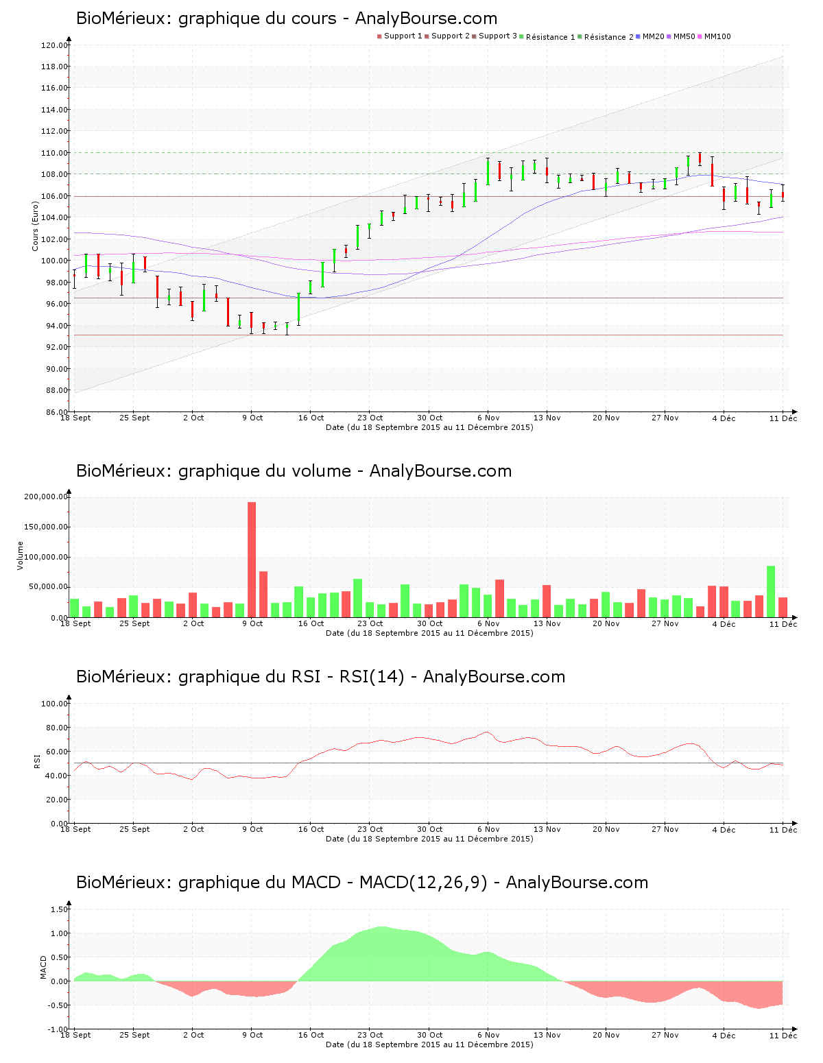 La moyenne mobile sur vingt jours de la valeur BioMérieux se positionne au-dessus de la moyenne mobile sur cinquante jours, qui se situe pour sa part au-delà de la moyenne mobile sur cent jours. Sur le long terme, l’action présente par conséquent un parcours croissant. La moyenne mobile sur vingt jours de la valeur BioMérieux se positionne finalement au-delà de sa moyenne mobile sur cinquante jours depuis 31 séances. De son côté, le RSI est stable ces derniers jours. C’est ainsi encore au niveau neutre que ce dernier se positionne. Enfin, l’indicateur MACD est en ferme régression ces cinq derniers jours. Il montre dorénavant une trajectoire du cours en solide décroissance à court-moyen terme.