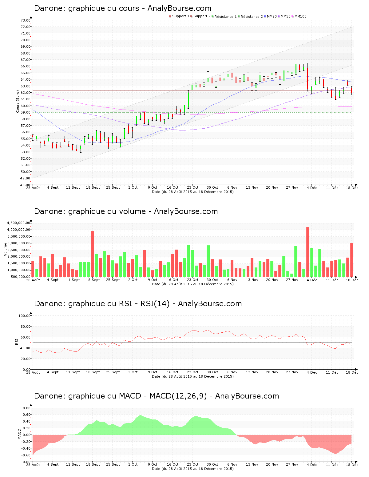 En ce qui concerne les indicateurs, le RSI est relativement stable ces derniers jours. Ce dernier se trouve ainsi toujours au niveau de vente. Ensuite, la moyenne mobile sur 20 jours de la valeur Danone est placée au-delà de sa moyenne mobile sur 50 jours, qui est quant à elle positionnée au-delà de sa moyenne mobile sur 100 jours. Sur la durée, le développement de la valeur est donc en hausse. Voici finalement 46 séances que la moyenne mobile sur 20 jours de l’action Danone se situe au-delà de sa moyenne mobile sur 50 jours. On constate que le MACD est en substantielle augmentation cette semaine. Il représente malgré ceci toujours une tendance du cours en forte régression sur le moyen terme.