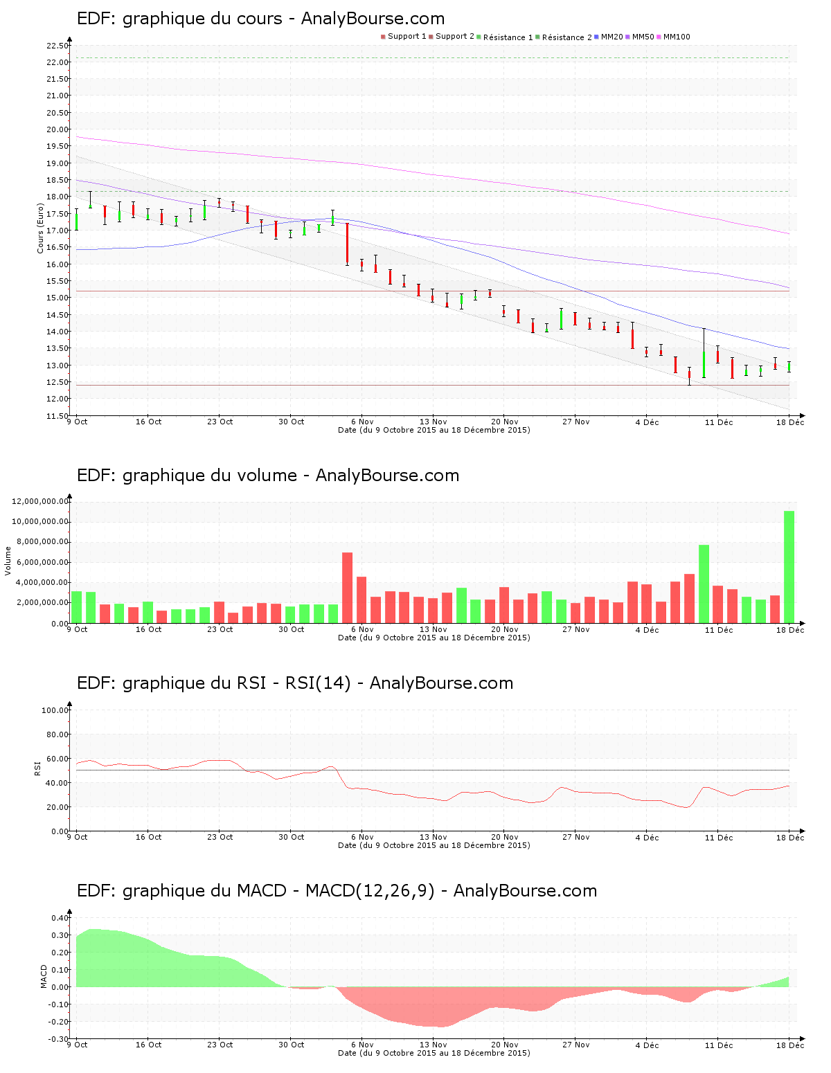 Côté indicateurs, on repère que ces cinq derniers jours le MACD est en ferme progression. Il esquisse maintenant une tendance du cours en conséquente progression à court-moyen terme. Le MACD a basculé en secteur positif mercredi dernier, cela peut caractériser un commencement d’une évolution croissante à longue échéance pour EDF. De son côté, la moyenne mobile sur vingt jours de l’action EDF se place en deçà de la moyenne mobile sur cinquante jours, et la moyenne mobile sur cinquante jours se situe pour sa part en deçà de la moyenne mobile sur cent jours. A longue échéance, le mouvement de l’action est ainsi en régression. Pour finir, on observe que ces dernières séances le RSI est assez stable. Il se trouve ainsi encore au niveau de vente.