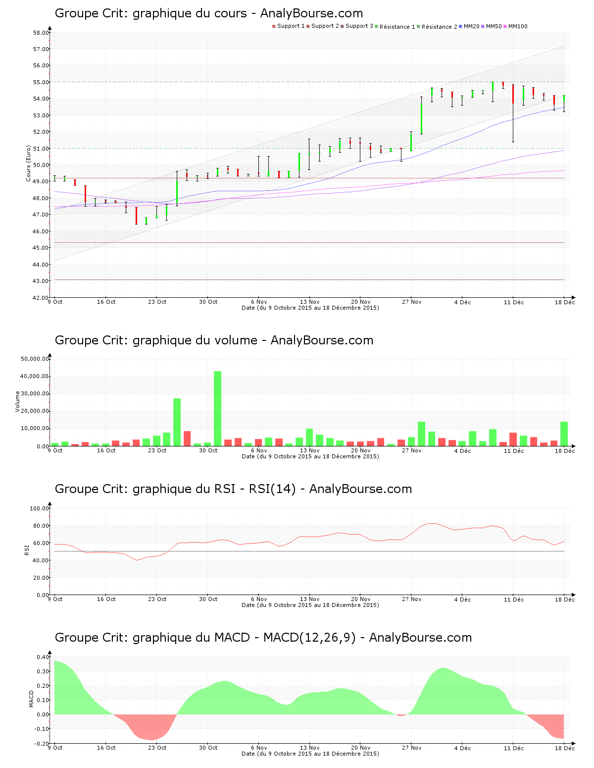 En ce qui concerne les indicateurs, l’indicateur MACD est ces derniers jours en substantielle diminution. Ce dernier caractérise finalement une évolution du titre en importante décroissance sur le moyen-court terme. Mardi dernier, le MACD a basculé en terrain négatif, cela peut révèler un enclenchement d’une évolution baissière à long terme pour Groupe Crit. Pour sa part, la moyenne mobile sur vingt jours de l’action Groupe Crit se positionne au-delà de la moyenne mobile sur cinquante jours, et la moyenne mobile sur cinquante jours se situe elle-même au-delà de la moyenne mobile sur cent jours. Sur le long terme, l’action affiche donc un mouvement en progression. Depuis dorénavant 42 séances, la moyenne mobile sur vingt jours de l’action Groupe Crit se positionne au-delà de sa moyenne mobile sur cinquante jours. Pour finir, on repère que l’indicateur RSI est plutôt stable cette semaine. C’est ainsi encore au niveau d’achat qu’il se localise.