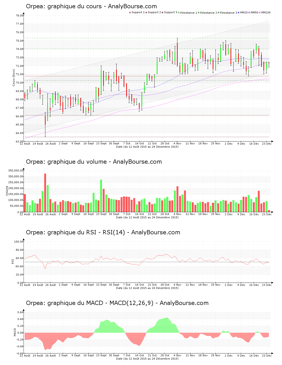 Pour les indicateurs, la moyenne mobile sur vingt jours de l’action Orpea est située au-delà de sa moyenne mobile sur cinquante jours, qui est elle-même placée au-delà de sa moyenne mobile sur cent jours. Le comportement de l’action est par conséquent en progression à longue échéance. Voici à présent 61 jours de cotations que la moyenne mobile sur vingt jours de la valeur Orpea se situe au-delà de sa moyenne mobile sur cinquante jours. De son côté, on remarque que le MACD est en conséquente baisse cette semaine. C’est désormais une évolution du titre en vigoureuse diminution qu’il caractérise à court-moyen terme. Lundi dernier, le MACD est passé du côté négatif, ce qui peut ébaucher un départ de tendance décroissante sur la durée pour Orpea. Concernant le RSI, on relève qu’il est en décroissance cette semaine. C’est finalement au niveau neutre qu’il se localise.