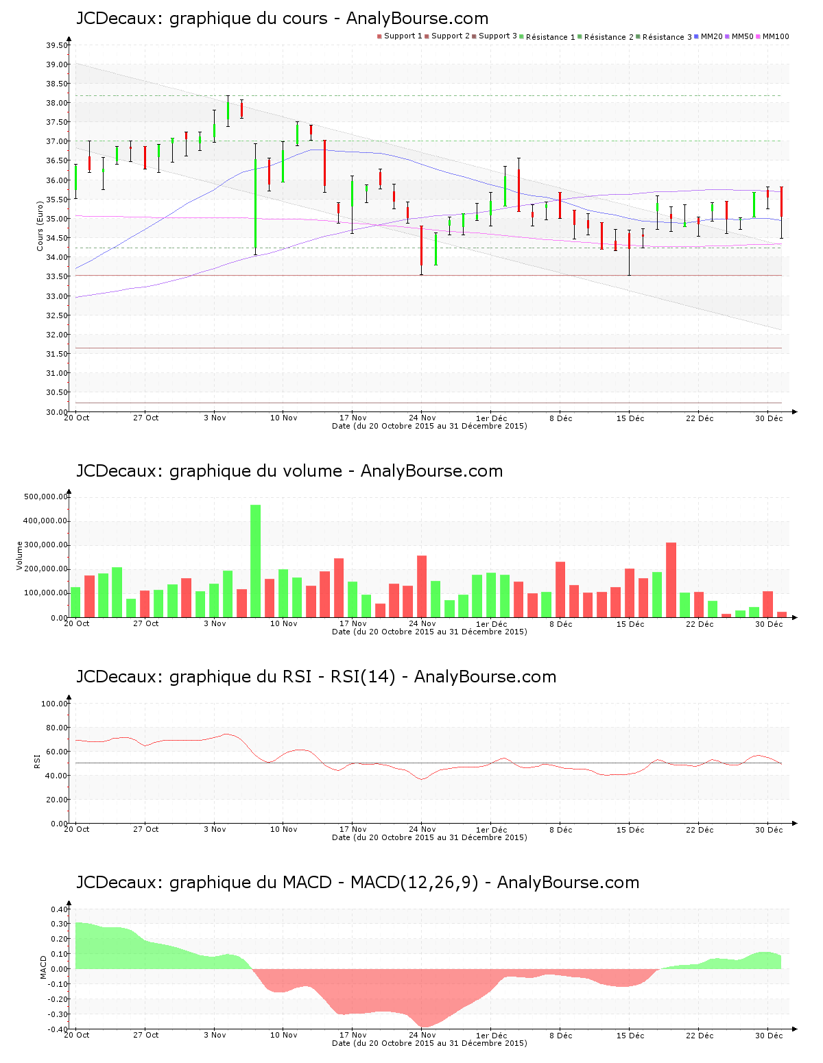 L’indicateur RSI est en diminution aujourd’hui. Il a basculé dans le niveau de vente, cela peut caractériser un début d’une trajectoire baissière pour l’action JCDecaux sur une longue période. On constate que ce jour l’indicateur MACD est en baisse. Il signale malgré ceci toujours une évolution du titre en grande augmentation sur le court-moyen terme.
