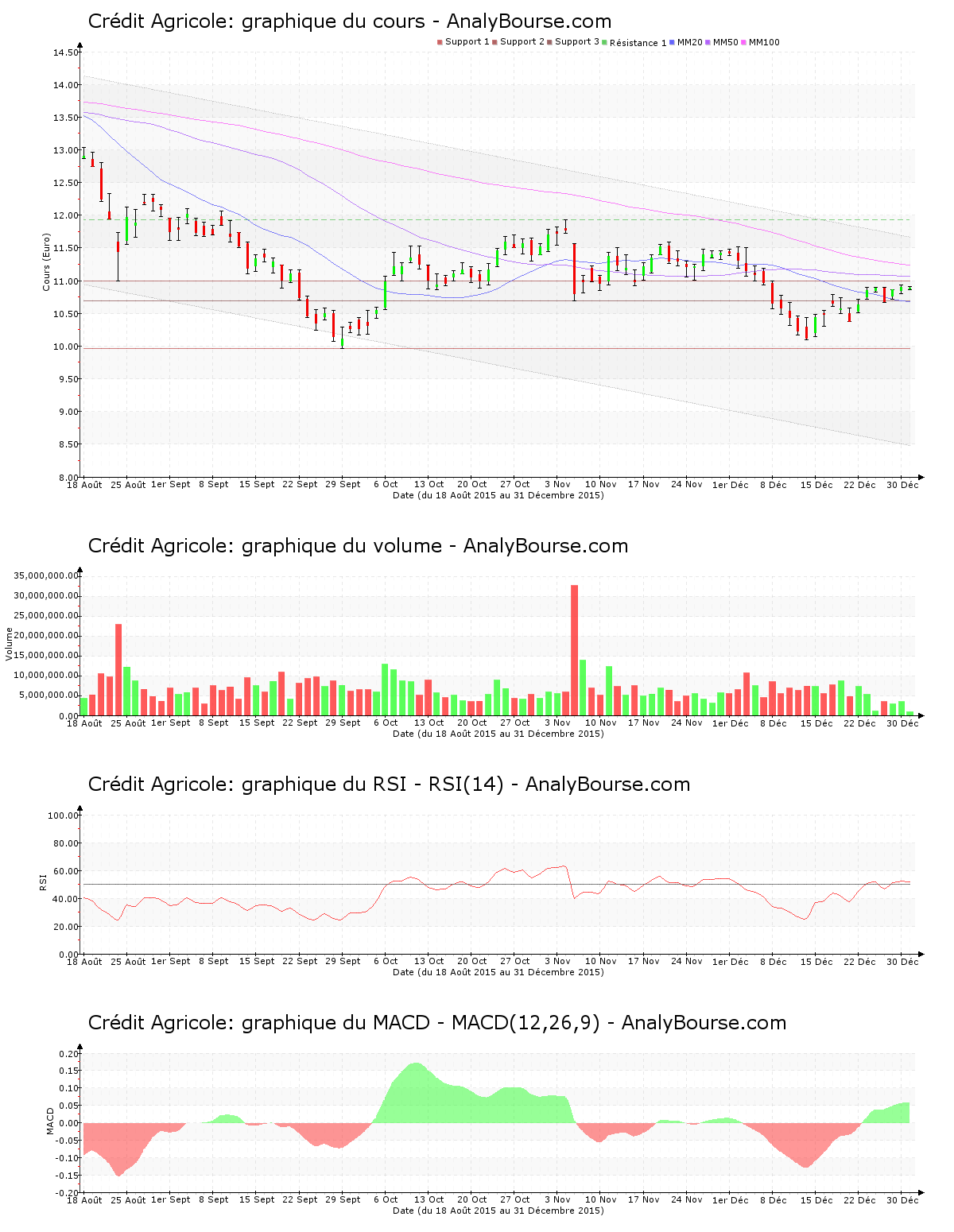 Du côté des indicateurs, la moyenne mobile sur vingt jours de la valeur Crédit Agricole se place en-dessous de la moyenne mobile sur cinquante jours, et la moyenne mobile sur cinquante jours se positionne quant à elle en deçà de la moyenne mobile sur cent jours. Sur le long terme, le mouvement de l’action est donc en décroissance. Ensuite, on constate que le RSI est plutôt stable ces dernières séances. C’est par conséquent toujours au niveau neutre que ce dernier se positionne. Pour finir, on note que le MACD est en hausse ces cinq derniers jours. C’est finalement une évolution du titre en ferme croissance que ce dernier indique sur le court-moyen terme.