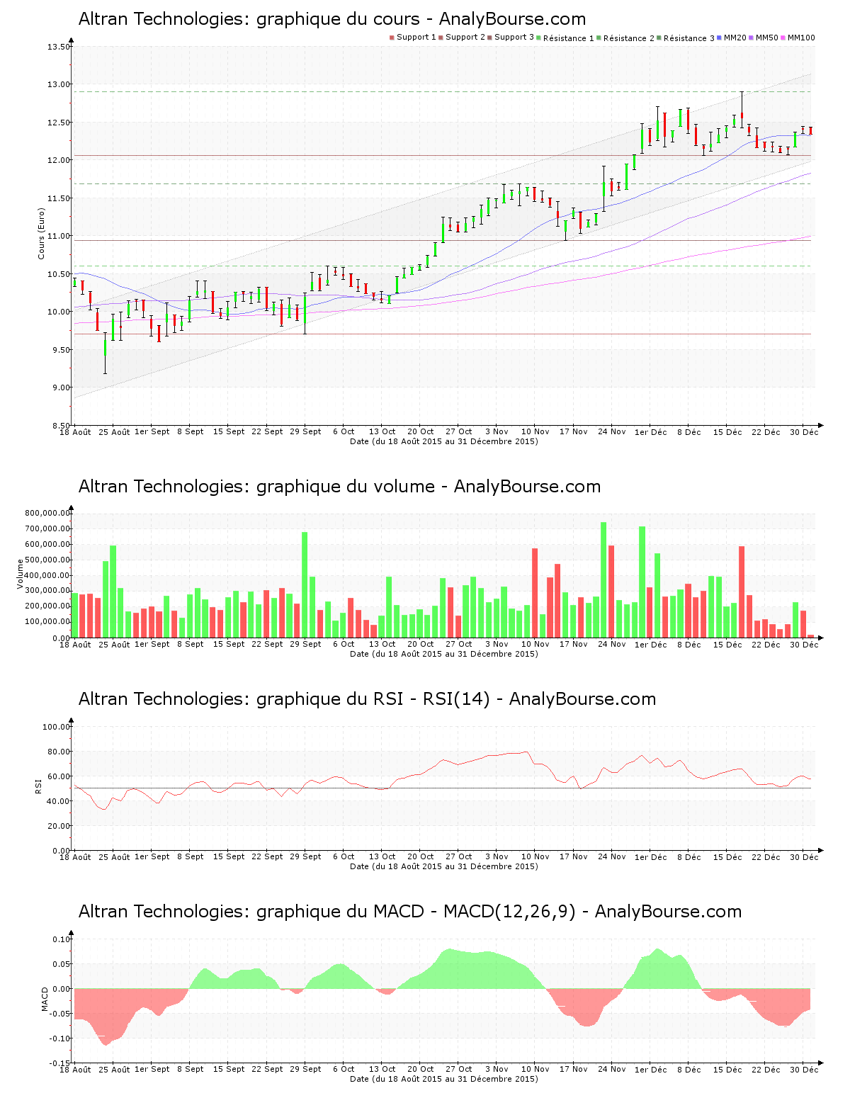 Pour les indicateurs, on repère que ces derniers jours l’indicateur MACD est en augmentation. C’est cependant encore une trajectoire du cours en baisse qu’il signale à moyen terme. Pour le RSI, on observe que ce dernier est stable ces cinq derniers jours. Ce dernier se trouve par conséquent encore au niveau d’achat. Pour terminer, la moyenne mobile sur 20 jours de la valeur Altran Technologies est située au-delà de sa moyenne mobile sur 50 jours, qui est quant à elle située au-delà de sa moyenne mobile sur 100 jours. A longue échéance, l’action enregistre par conséquent un développement en hausse. La moyenne mobile sur 20 jours de la valeur Altran Technologies se localise maintenant au-dessus de sa moyenne mobile sur 50 jours depuis 59 jours.
