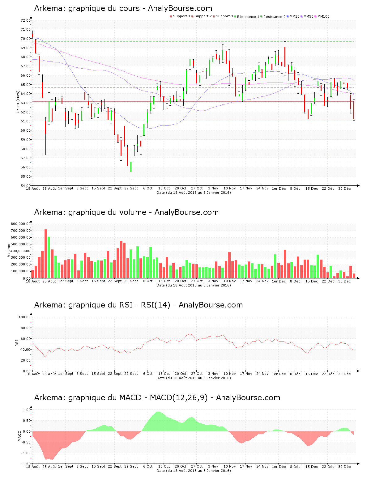 Il s’agit de la première fois depuis plus de 63 séances que la valeur Arkema dépasse ce seuil. Le mouvement décroissant de la valeur Arkema persiste désormais depuis 4 séances. Le titre de Arkema chute ainsi depuis mercredi dernier, avec un mouvement baissier de 6.38%. Avec un cours décroissant de 1.81%, le bilan est toujours négatif ce jour pour l’action Arkema, dans un volume de sensiblement 65000 titres échangés à 13:32. La valeur se dévalorise à présent de 1.130 €, allant de 62.350 € à 61.220 €. Arkema était hier affaibli, avec un mouvement en grande décroissance de 3.47%. Le mouvement baissier perd de l’ampleur ce mardi 5 janvier. Le comportement du titre le mène dorénavant à proximité du support des 61.010 €. Le cours naviguant dans des limites de 3.67%, Arkema traduit une relative effervescence ce jour.
