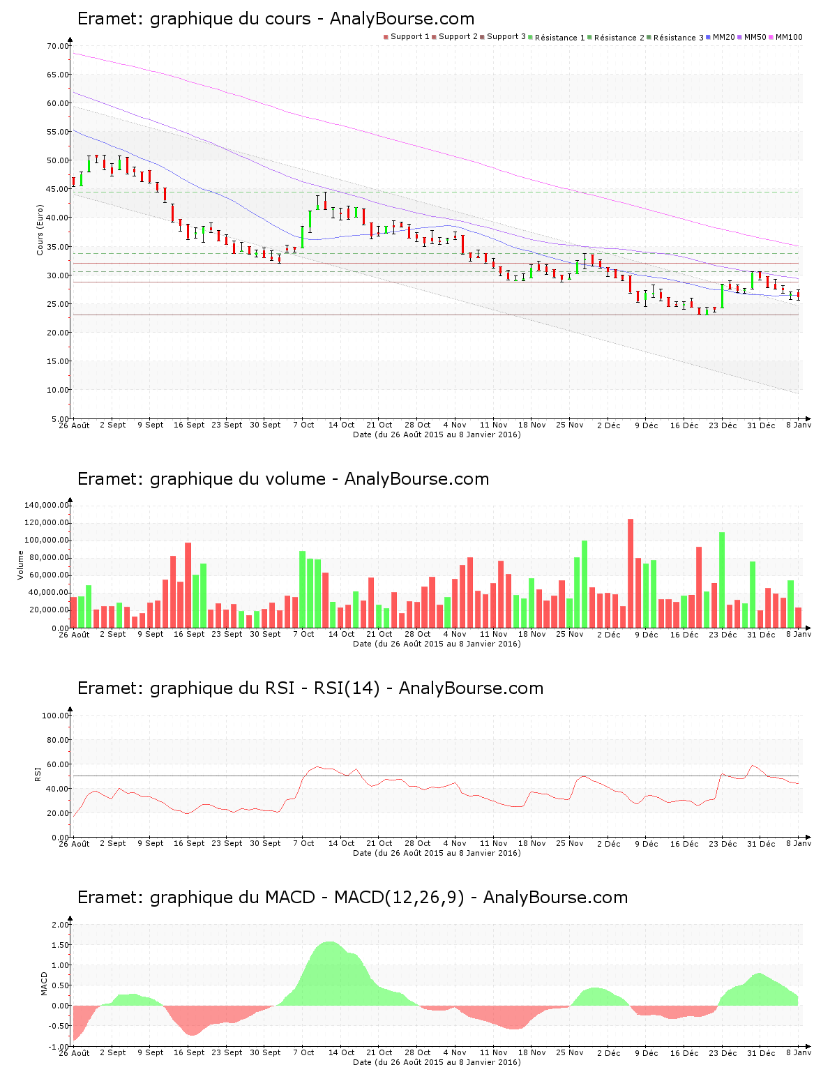 Le mouvement décroissant de l’action Eramet continue à présent depuis six séances de cotations. La sollicitation sur le titre de Eramet depuis le jeudi 31 décembre 2015 est par conséquent extrêmement faible, animée par un comportement baissier de 13.40%. Avec un volume à 13:57 d’approximativement 23000 titres échangés, avec un cours décroissant de 1.35%, la valeur Eramet est toujours en décroissance ce jour. Evoluant de 26.590 € à 26.230 €, l’action s’effrite maintenant de 0.360 €. Avec un cours en diminution de 2.81%, le résultat était franchement défavorable hier pour Eramet. Le mouvement en baisse perd en vitesse ce vendredi 8 janvier. L’action oscille aujourd’hui dans un range de 7.27%, montrant une substantielle nervosité sur le titre.