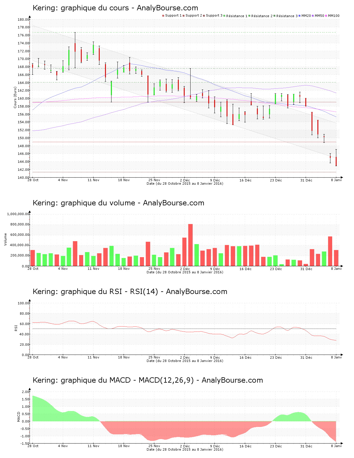 Il s’agit de la première fois que la valeur Kering passe ce niveau depuis 68 séances de cotations. Symbolisée par un cours en décroissance de 9.50%, l’action Kering montre toujours ces cinq derniers jours une solide pression vendeuse. La valeur décroche finalement de 15.000 €, démarrant à 157.950 € pour accéder à 142.950 € ces dernières séances. Avec un cours en régression de 1.86%, elle s’effritait déjà la semaine dernière. Depuis la semaine dernière, la valeur accélère par conséquent son parcours en baisse. Le cours a franchi le support des 148.900 € cette semaine. Le prochain support se positionne à 141.300 €. L’action évolue sérieusement en deçà de son canal. Elle ne se développe en effet plus dans le canal dans lequel elle s’enfermait depuis un certain temps. Depuis le jeudi 5 novembre 2015, date de son entrée dans le canal, la valeur a abandonné 14.38%.