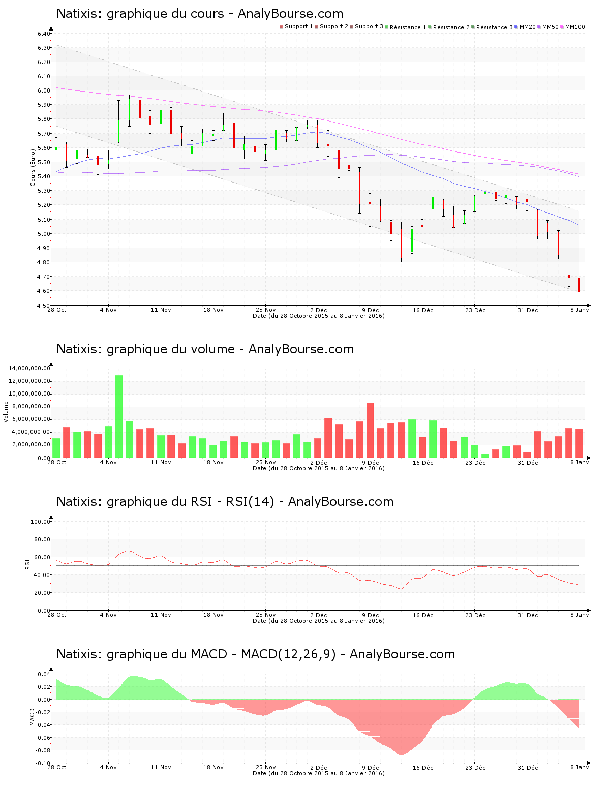 La valeur Natixis s’effondre cette semaine, avec un cours en régression de 12.07%. Cette dernière chute dorénavant de 0.630 €, commençant à 5.220 € pour aboutir à 4.590 € ces derniers jours. Avec un comportement baissier de 0.76%, le parcours était à l’équilibre la semaine dernière pour Natixis. La valeur reprend par conséquent son comportement baissier. Le cours a passé le support des 4.800 € cette semaine. La valeur est sortie par la borne inférieure du canal à l’intérieur duquel elle se bornait ces dernières semaines. Cette dernière se situe maintenant en-dessous de son canal. Depuis le jeudi 5 novembre 2015, date de son entrée dans le canal, la valeur a abandonné 20.73%.