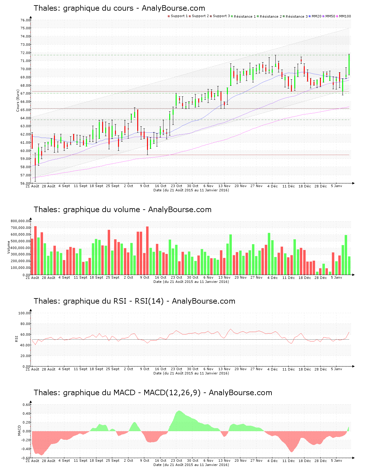 On remarque que ce lundi 11 janvier le MACD est en ferme hausse. Ce lundi 11 janvier, l’indicateur MACD a basculé en secteur positif, ce qui peut caractériser un départ de tendance haussière pour l’action Thales à longue échéance.