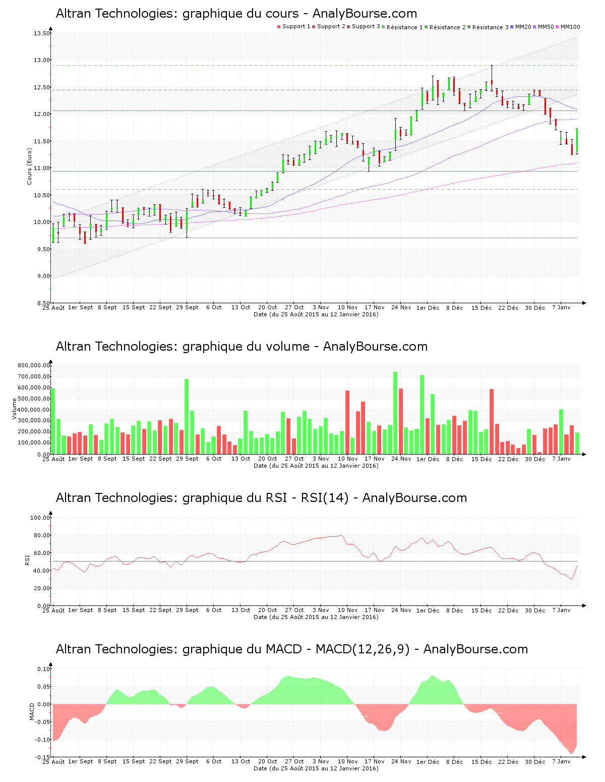 Le parcours est franchement positif ce mardi pour Altran Technologies, avec un cours croissant de 4.27%, avec un volume à 13:23 de 195000 actions échangées. L’action atteint désormais la somme de 11.720 €. Animée par un cours en diminution de 1.83%, Altran Technologies subissait par contre hier une pression vendeuse. L’action Altran Technologies bondit donc de manière importante aujourd’hui. Le cours a passé la résistance des 11.680 € ce mardi 12 janvier. La prochaine résistance se trouve à 12.440 €. Altran Technologies présente une sensible nervosité ce jour, le titre fluctuant dans un range de 4.18%.