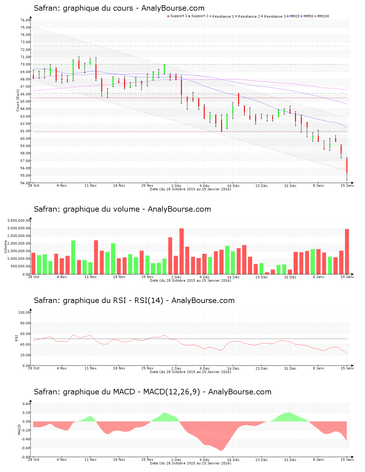 |Avec un parcours baissier de 7.10%, la valeur Safran est encore en conséquente diminution ces cinq derniers jours. La valeur s’apprécie finalement à 55.380 €. L’intention d’achat sur cette dernière la semaine dernière était déjà extrêmement faible, affectée par un cours en décroissance de 5.93%. Le cours de Safran s’écroule par conséquent sur deux semaines de cotations, avec un cours décroissant de 12.61% en deux semaines de cotations. Constatons, avec un pourcentage de 11.10% qui éloigne ces dernières séances les extrêmes, une solide nervosité sur la valeur. L’action a cassé la zone inférieure du canal à l’intérieur duquel elle se restreignait depuis un certain temps. Cette dernière se positionne maintenant en-dessous de son canal. Depuis le jeudi 5 novembre 2015, jour de son entrée dans le canal, l’action a reculé de 18.25%.