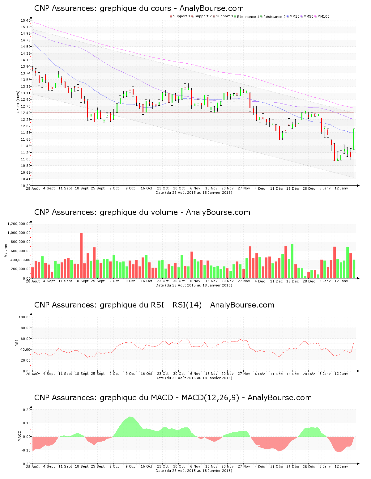 Avec un volume à 10:03 d’approximativement 409000 actions échangées, la sollicitation sur CNP Assurances ce jour est extrêmement importante, affectée par un cours en augmentation de 8.03%. La valeur atteint à présent la cotation de 11.980 €. Symbolisée par un cours décroissant de 1.86%, CNP Assurances subissait à l’inverse vendredi dernier une pression vendeuse. L’orientation s’inverse donc de manière importante aujourd’hui. Le cours évoluant dans un range de 5.83%, CNP Assurances affiche une manifeste agitation ce lundi 18 janvier. Le cours navigue finalement à proximité de la résistance des 12.550 €.