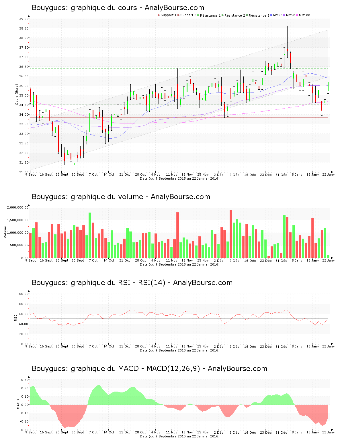 Côté indicateurs, l’indicateur RSI est ce vendredi 22 janvier en hausse. Il est passé au niveau d’achat, ce qui pourrait dessiner un enclenchement d’une trajectoire haussière à longue échéance pour la valeur Bouygues. Concernant l’indicateur MACD, on remarque qu’il est en conséquente hausse ce jour. C’est malgré tout encore une évolution du cours en substantielle régression qu’il dessine sur le moyen terme.