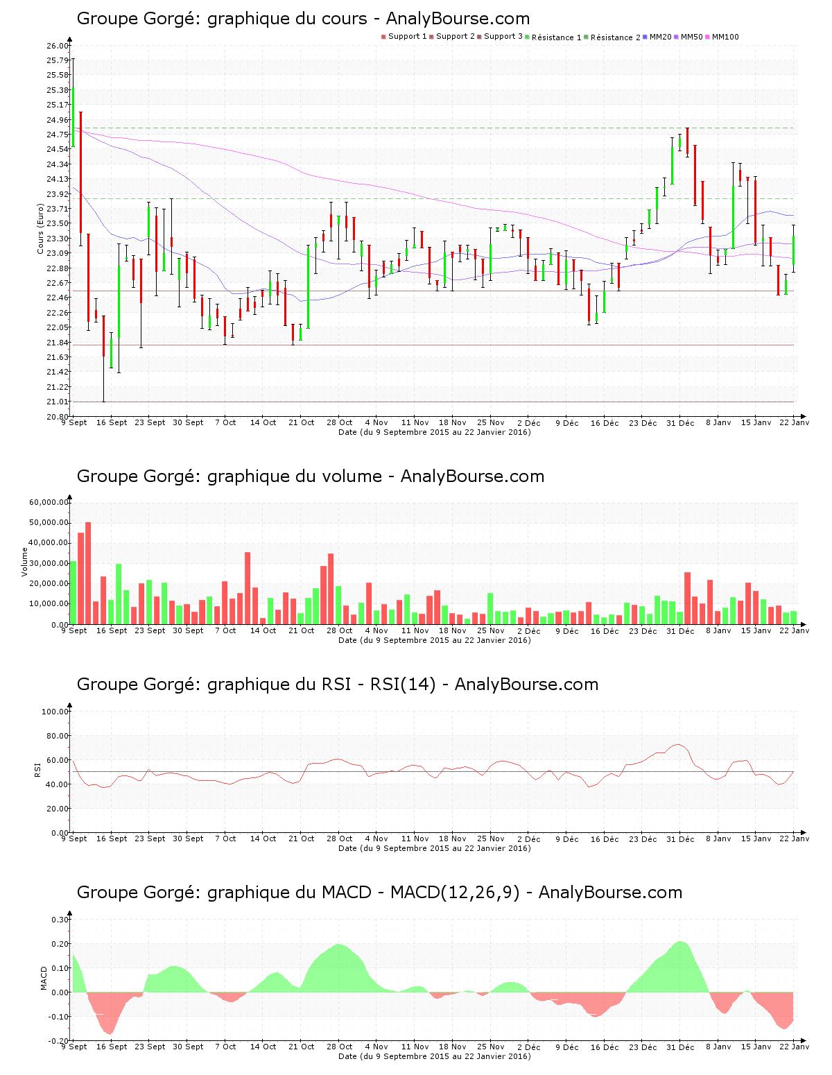Ces informations constituent une analyse technique de l’action Groupe Gorgé au samedi 23 janvier 2016. Cette analyse peut être invalidée par des éléments plus récents, et ne constitue en aucune manière une incitation d’achat ou de vente sur les marchés financiers. Le lecteur reste libre et responsable de l’interprétation et de l’usage faits de ces informations.