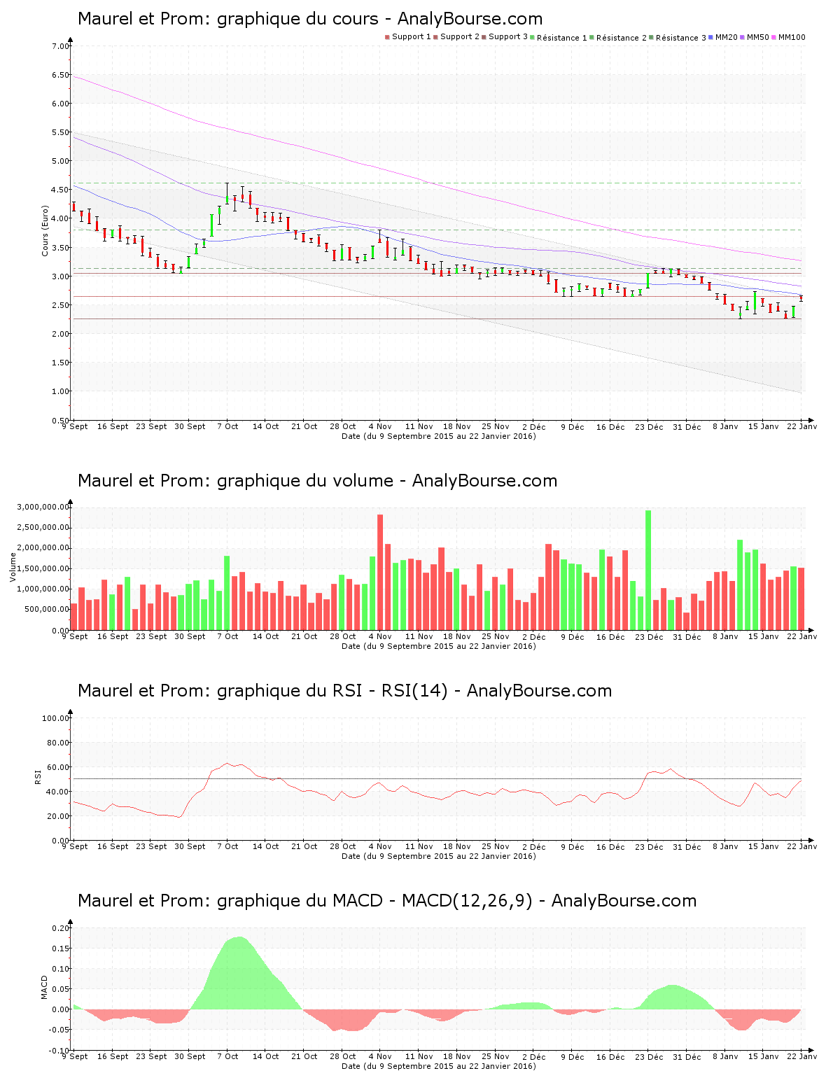 Ces informations constituent une analyse technique de la valeur Maurel et Prom au dimanche 24 janvier 2016. Cette analyse peut être invalidée par des éléments plus récents, et ne constitue en aucune manière une incitation d’achat ou de vente sur les marchés financiers. Le lecteur reste libre et responsable de l’interprétation et de l’usage faits de ces informations.