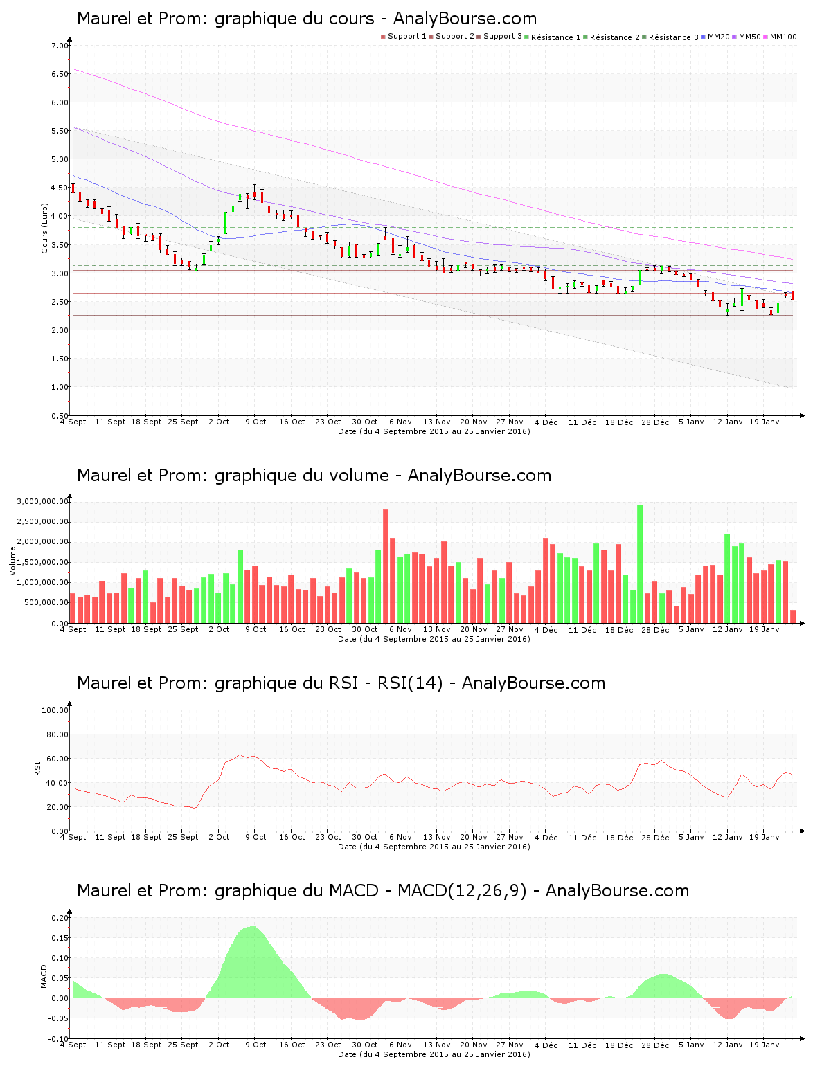 Le MACD est plutôt stable ce lundi. L’indicateur MACD est passé en terrain positif ce lundi 25 janvier, ce qui peut caractériser un commencement d’une trajectoire haussière sur la durée pour l’action Maurel et Prom.