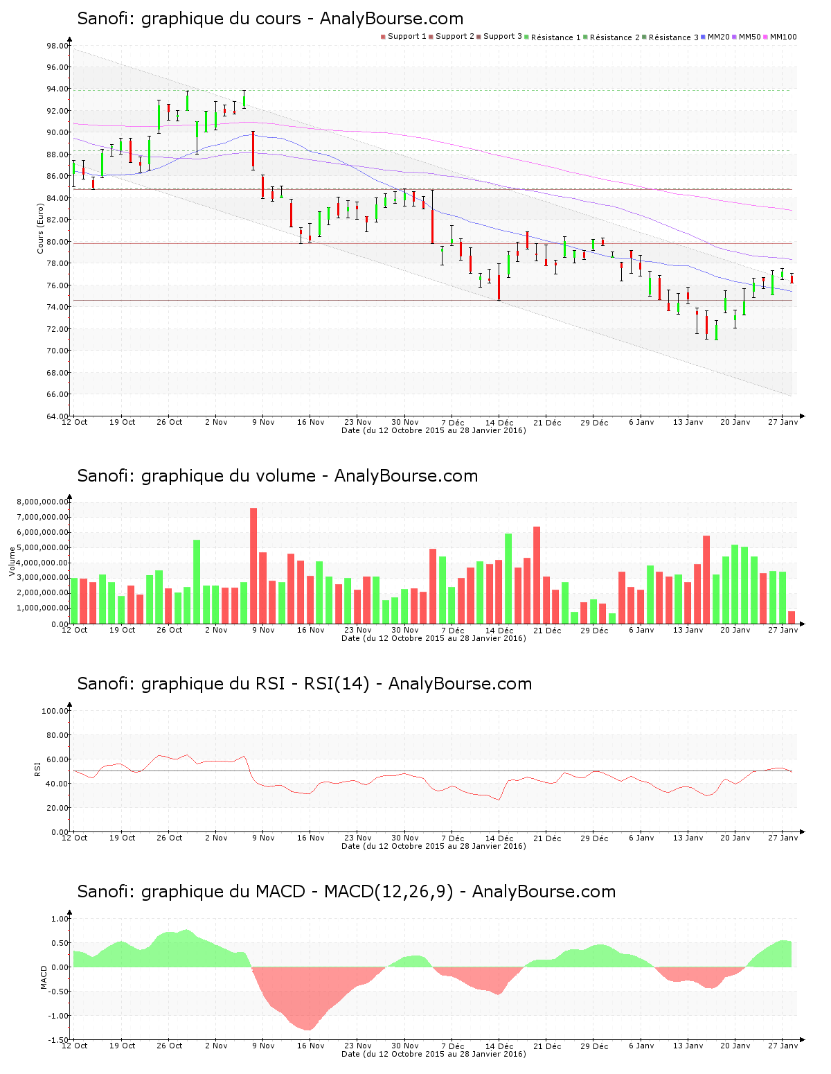 L’indicateur RSI est en diminution ce jeudi 28 janvier. Il a basculé au niveau de vente, cela peut dévoiler une base d’une orientation en décroissance pour la valeur Sanofi sur la durée. Le MACD est en régression aujourd’hui. C’est cependant encore une évolution du titre en importante augmentation qu’il signale à court-moyen terme.
