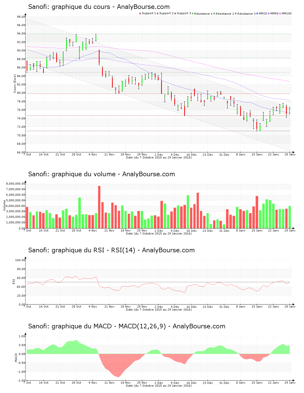 |La sollicitation sur l’action Sanofi ces dernières séances est neutre, symbolisée par un cours haussier de 0.46%. Cette dernière augmente faiblement en effet seulement de 0.350 €, débutant à 76.200 € pour parvenir à 76.550 € ces cinq derniers jours. Matérialisée par un mouvement haussier de 6.57%, Sanofi montrait au contraire la semaine dernière une substantielle pression acheteuse. L’action fluctue juste au-dessus de son canal. Elle ne se borne en effet plus dans le canal à l’intérieur duquel cette dernière se limitait depuis plusieurs semaines.