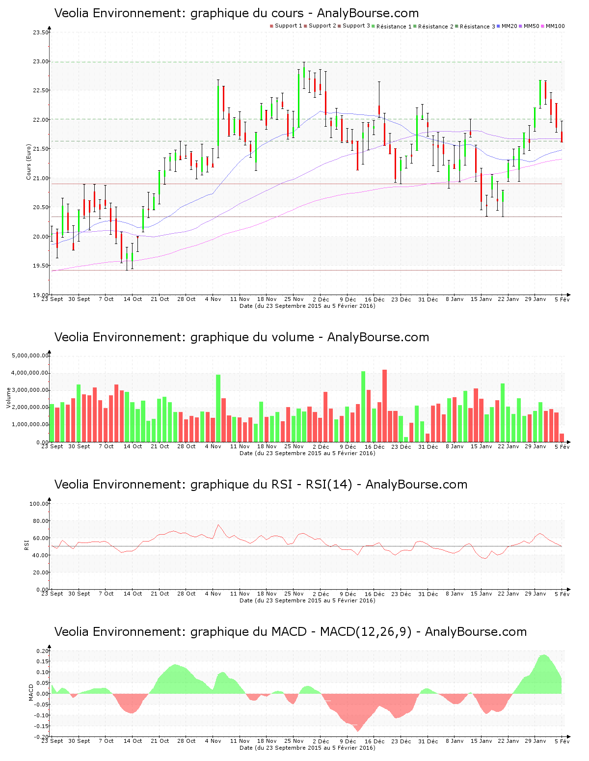 Du côté des indicateurs, le MACD est aujourd’hui en décroissance. C’est toutefois toujours une trajectoire du titre en vigoureuse croissance qu’il indique sur le moyen-court terme. L’indicateur RSI est aujourd’hui en décroissance. Il a basculé au niveau de vente, ce qui peut esquisser un engagement d’une évolution décroissante à longue échéance pour l’action Veolia Environnement.