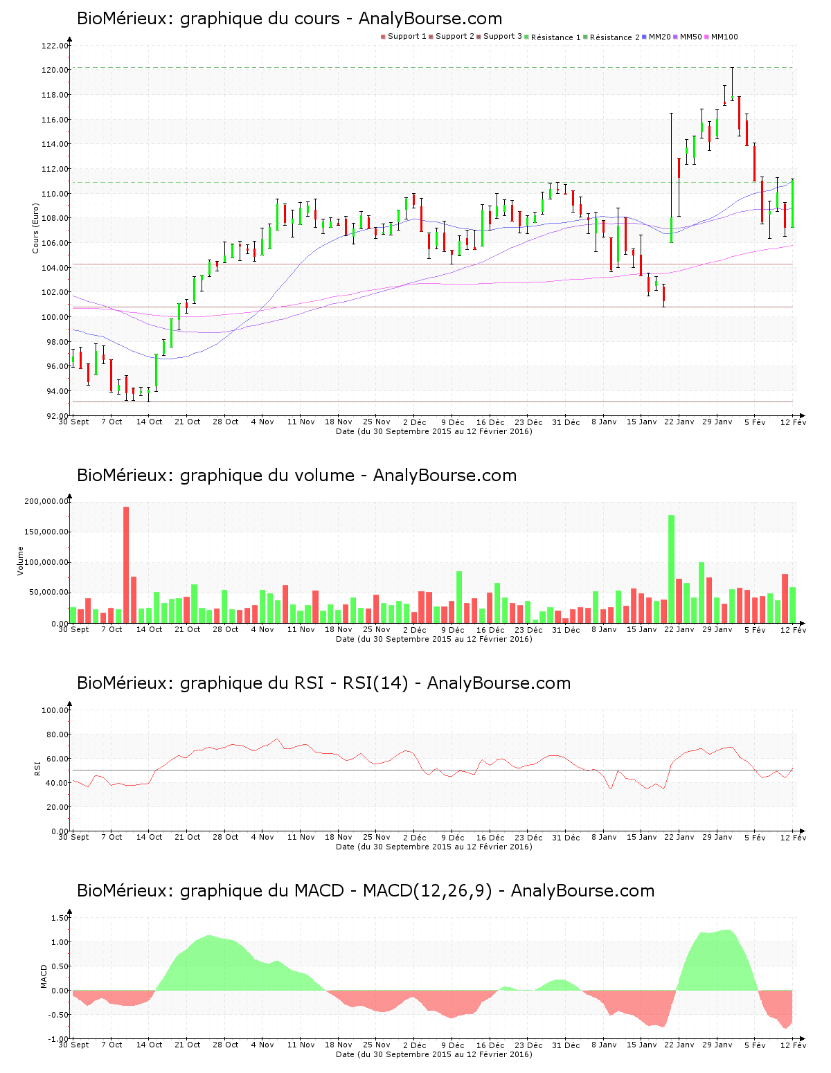 On remarque que ce vendredi le RSI est en croissance. Il est passé dans le niveau d’achat, ceci peut représenter un amorcement d’une orientation en hausse pour la valeur BioMérieux sur le long terme. Le MACD est en substantielle augmentation ce vendredi 12 février. C’est malgré ceci encore une évolution du titre en ferme régression qu’il indique sur le moyen terme.